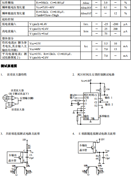 1同相输入,2反相输入,3反馈,4死区电压控制,5定时电容,6定时电阻,7地,8驱动管集电极1,9驱动管发射极1,10驱动管发射极2,11驱动管极电极2,12电源,13输...1同相...