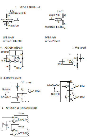 非反相引脚连接到 Ref 引脚,而反相引脚连接到地。测试输入提供给 DTC 和 FEEDBACK 引脚。外部电容和电阻连接到引脚 5 和 6 以控制振荡器频率。误差放大器将 5V 输出的样本与基准进行比较,并调整 PWM 以保持恒定的输出电流