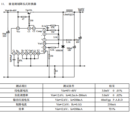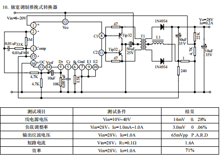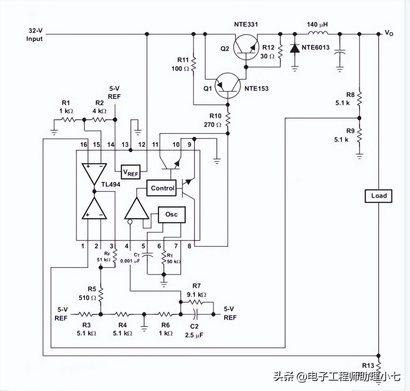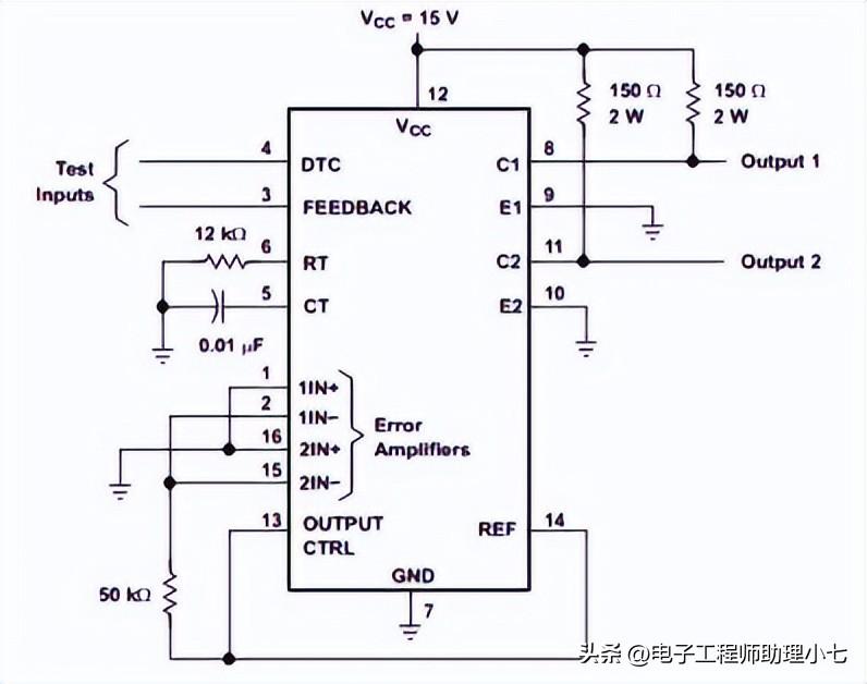 下面电路图展示了如何有效配置 TL494 以创建 5V/10A 开关降压电源 。在此配置中,输出以并行模式工作,因此我们可以看到输出控制引脚 13 接地。