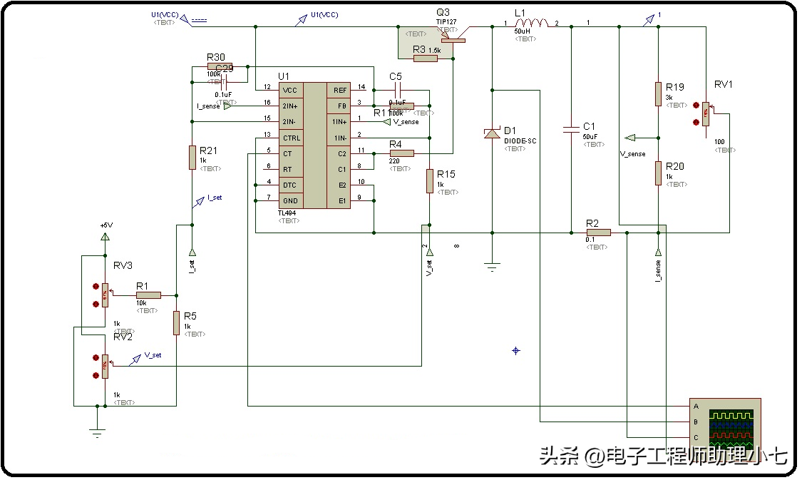 下面电路图 TL494 为例设计了一个降压转换器 。降压转换器的输入为 25 V,输出范围为 7 至 19 V。用户可以借助下图所示的可变电阻器来改变输出电压。TIP127 用作开关器件。