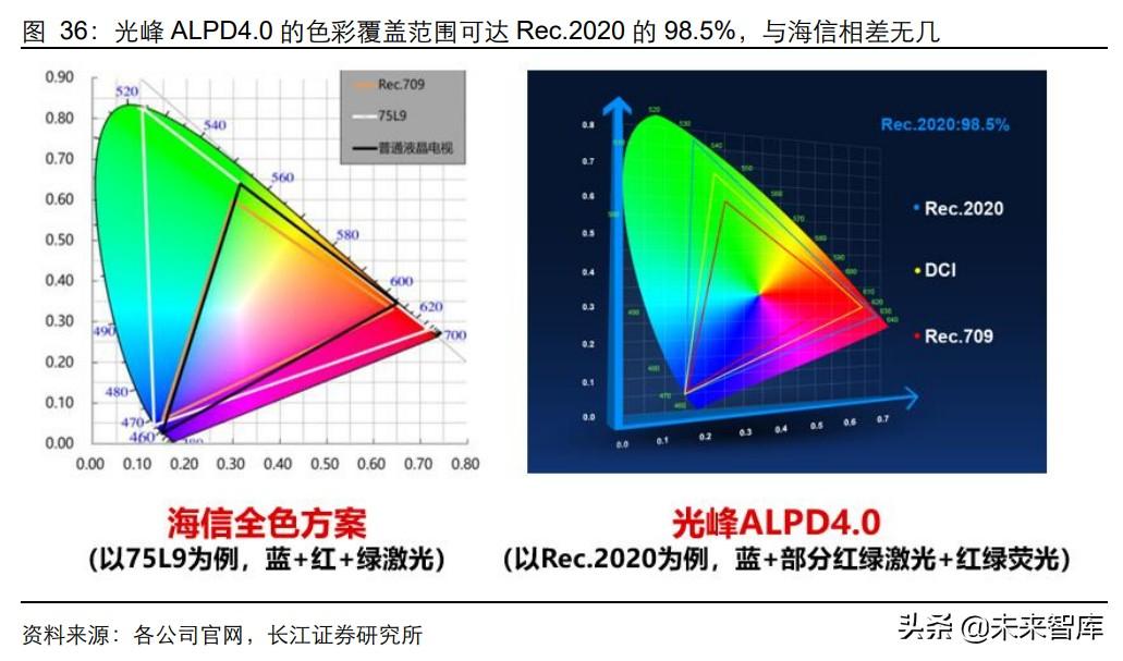 海信选择专注攻破三色方案难关,视单色、双色方案为短暂过渡,以较快节 奏由单色向双色、全色推进,实现目前最为优秀的色彩丰富度;而光峰选择稳扎稳打, 逐步推进激光+荧光技术的更新换代,正一步步走向画质更加出众的 ALPD4.0。两大品 牌或许技术路径选择不同,升级节奏不同,但最终都朝向全色方案前进,可谓“殊途同 归”。