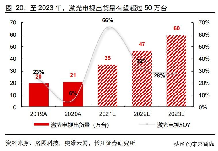 假设激光电视对 65 英寸及以上尺寸彩电替代率稳步提升,分别于 2021 年、2022 年和 2023 年达到 2.30%、2.60%和 2.90%,则 2023 年中国激光电视出货量有望 超过 50 万台。