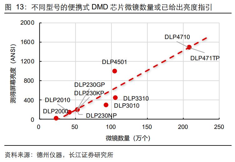 若使用相同的 4K 级 DMD 芯片,则激光电视的有望凭借激光光源高亮度的优势,实现 比智能微投更“亮眼”的屏幕亮度水平。 屏幕亮度很大程度由光学部件与整机设计综合 决定,一方面,光源决定了可以产生的光量,而另一方面,光学设计与整机设计也是屏幕亮度水平提升的重要因素。以市场上激光电视 最常用的 4K 芯片型号 DLP471TP 为例,其典型亮度为 1500ANSI 流明,而激光电视可 在此基础上结合高亮度激光光源与精良的光学、整机设计,进一步上探屏幕亮度水平。