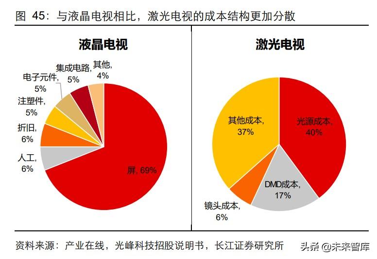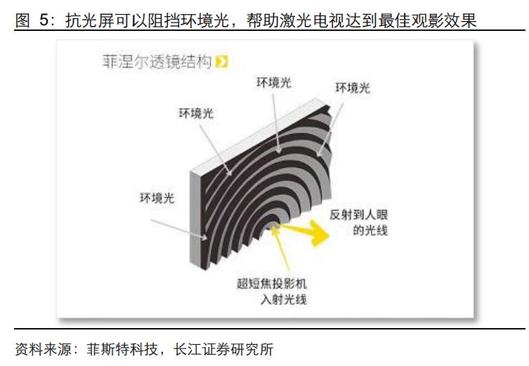 而对比激光电视与智能微投,智能微投主要采用 LED 光源+中长焦的光学方案,光路设 计与整机设计较为简单,对应体积较小、重量较轻,因此适合在各种场景间来回移动, 与电视形成了不完全的竞争关系,是全新的大屏需求;而激光电视采用超短焦的光路设 计方案,对应更多镜片以保证画面在超短距离内准确放大,光路设计较为复杂,体积与重量相对更大,所以激光电视应用场景集中在客厅,定位于满足沉浸式观影体验,与传统彩电的竞争关系更为直接。