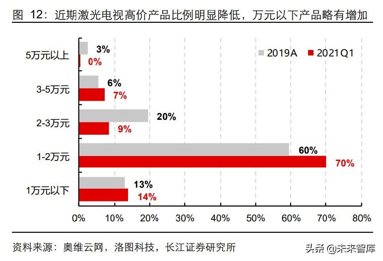 站在当前激光电视市场看,整体市场均价自 2018 年以来下降幅度趋缓,截至 2021Q1, 激光电视均价仍维持在 1.5 万元以上水平,而大众市场消费者普遍希望购买 1 万元以下 的激光电视;但近期激光电视均价已有边际改善趋势,分尺寸结构看,2021Q1 激光电 视的主流价格带在 1-2 万元之间,5 万元以上高价产品的比例已明显下降低,而 1 万元 以下产品比例则略有增加。