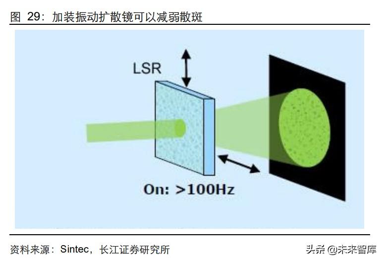海信完全采用激光光源,攻破的主要技术难关为散斑问题。 激光色彩的纯正度高,但同 时具有强相干性的特点,这两项特点都由激光窄频宽的本质所决定,当激光照射至粗糙表面,反射进入人眼时,激光光束之间互相产生干涉,观看者从而感受到明暗分明的噪点,而在较高亮度的画面中,散斑现象更为明显,严重影响画面效果。除了直接采用激 光+荧光方案之外,减弱散斑效应的主要方法包括: