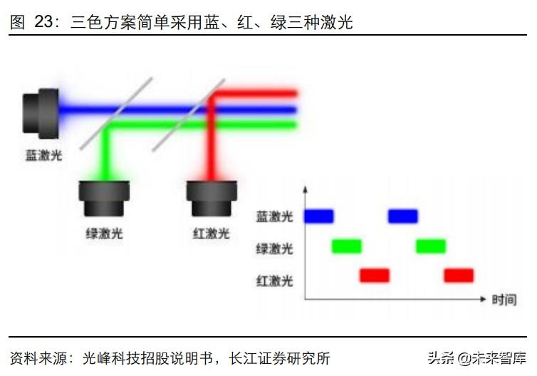 在光峰 ALPD 技术的后续版本中,公司首先在 1.0 基础上使用热稳定性较好的黄荧光滤 得红光,并使用反射式荧光轮,减少亮度损耗,之后逐步添加少量红、绿激光器,提升 色彩丰富度,未来的 ALPD5.0 与 ALPD6.0 计划使激光显示效果更极致,同时降低激光 显示成本。