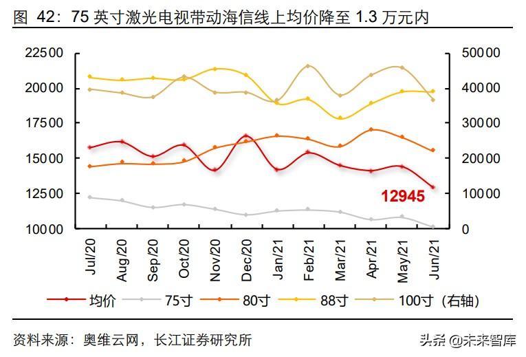 更亲民的价格: 过去定位于社会中坚力量的消费品,激光电视不论是在海信强势的 线下渠道,还是 2020 年以来才逐步发力的线上渠道,目前在第三方数据所显示的 均价都呈现下降趋势,既有 75 英寸销量占比提升的结构调整贡献,又有各尺寸典型产品均价下行贡献。就海信而言,我们判断激光电视均价均匀、有节奏的下降, 或较大程度上体现了生产成本的稳步下行。