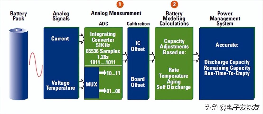 计量系统的输入是电池电压、电流和温度,然后通过对电池建模来计算输出容量信息,在算法与固件之前,硬件是最基础的前提,没有性能优异的硬件来实现高精度采样以及低功耗的运行,准确的计量也就无从谈起。