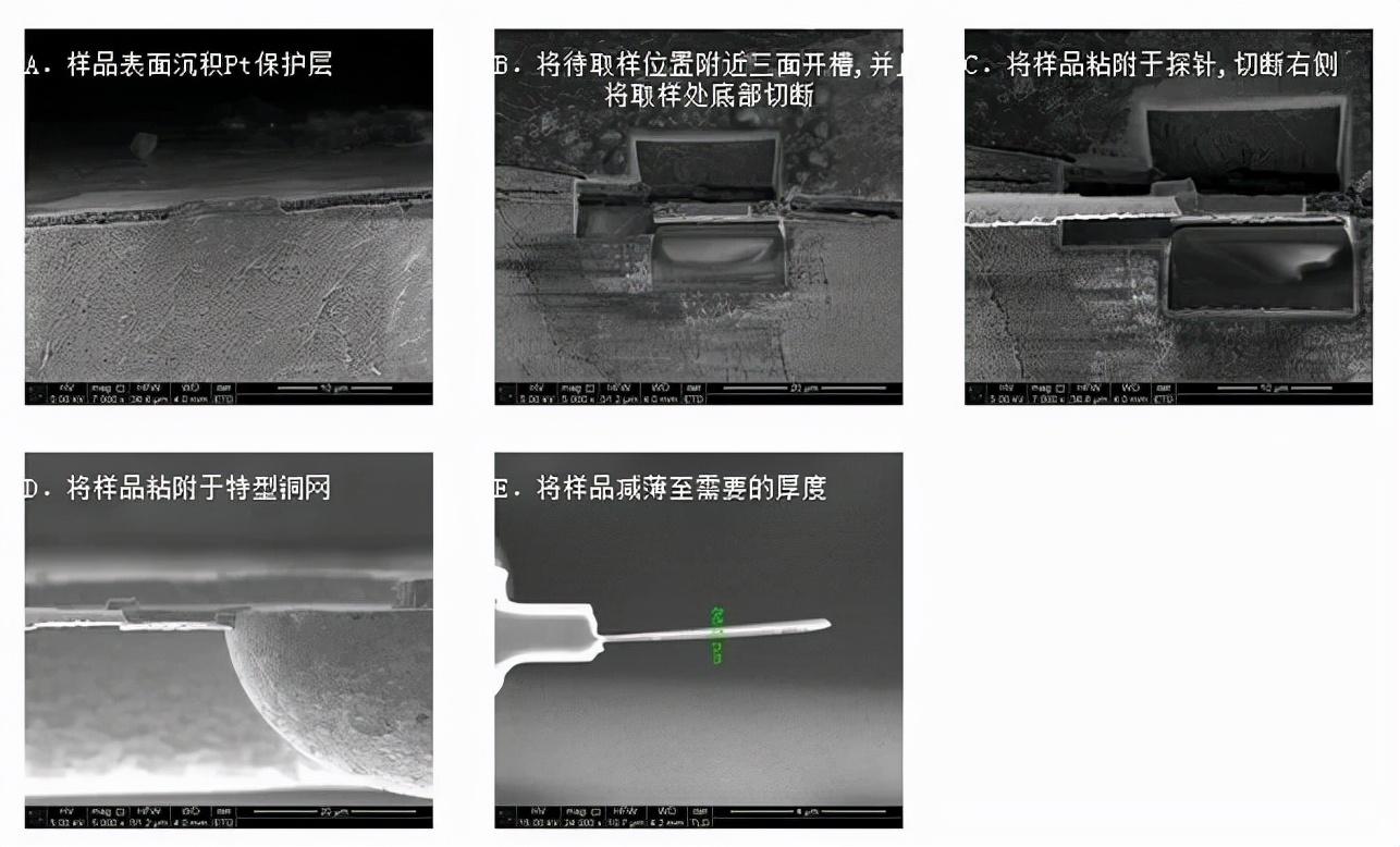 无论是透射电镜还是扫描透射电镜样品都需要制备非常薄的样品,以便电子能够穿透样品,形成电子衍射图像。传统的制备TEM样品的方法是机械切片研磨,用这种方法只能分析大面积样品。采用聚焦离子束则可以对样品的某一局部切片进行观察。与切割横截面的方法一样,制作TEM样品是利用聚焦离子束从前后两个方向加工,最后在中间留下一个薄的区域作为TEM观察的样品。下图所示为TEM制样的工艺过程。
