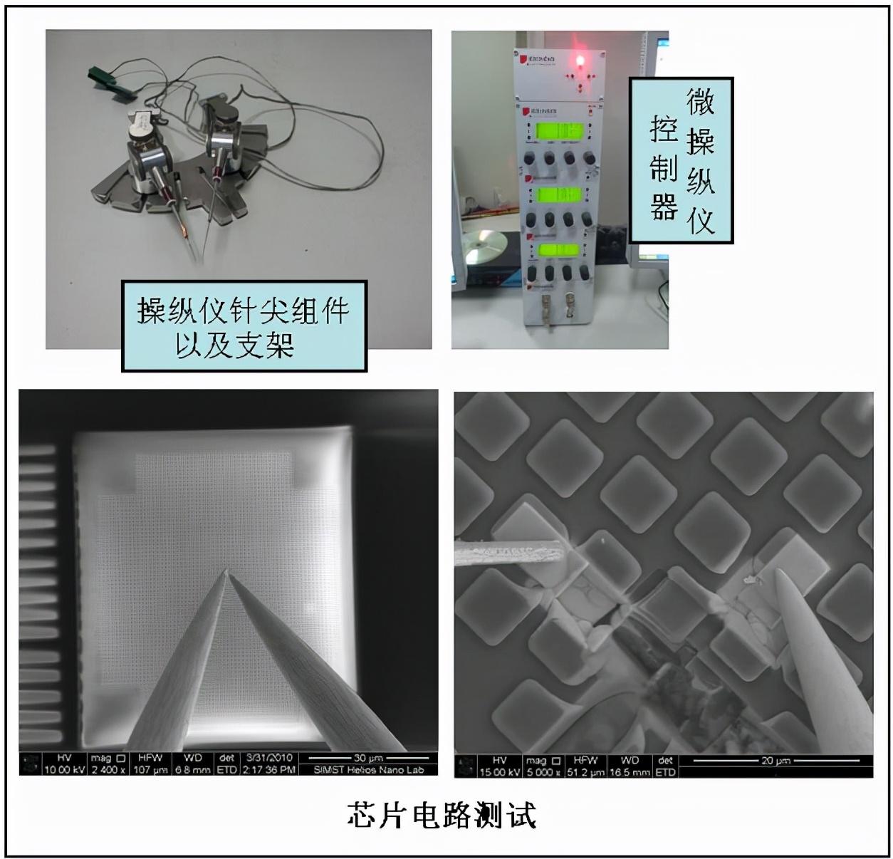 微操纵仪(Kleindiek Nanotechnik MM3A)具有纳米级的步进精度,X轴和Y轴的转动量为120度,于水平进退(X轴)、水平转动(Y轴)以及垂直转动(Z轴)方向,的位移精度分别为2、2.5、0.2nm。MM3A微操纵仪由压电马达、针尖组件、控制单元和外围支架组成。压电马达由定子和滑块组成。压电马达由伸长量为1um的压电陶瓷实现高精度位移,马达驱动电压为-80v~+80v,驱动模式分为精调模式和粗调模式各三档,采用一个12位数模转换器,将X、Y和Z方向的步进分成4096步,从而实现纳米级的精确位移。本系统最多可独立加载三路电压。