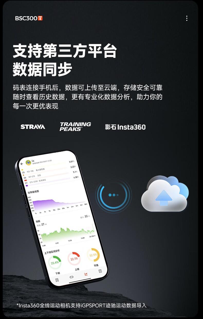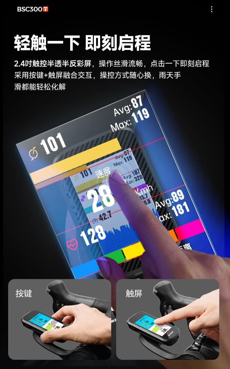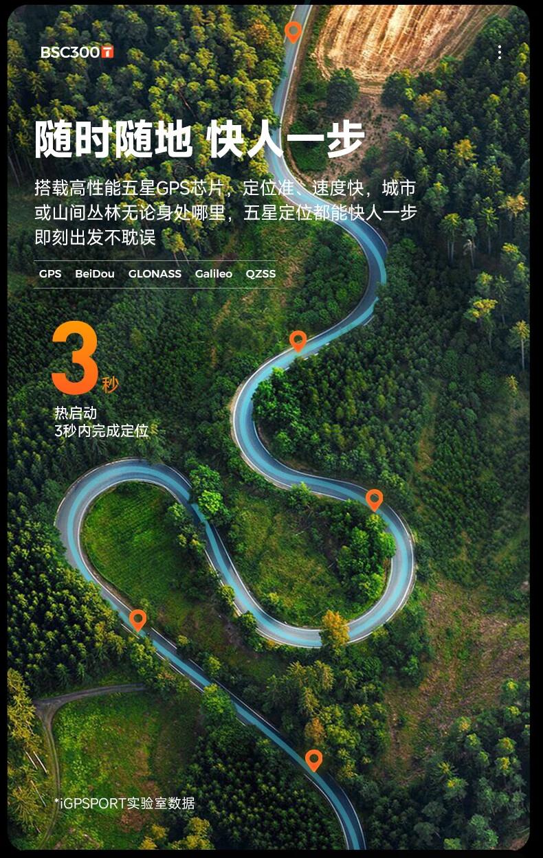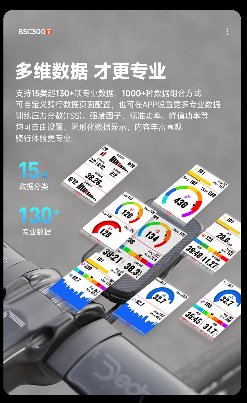 迹驰 BSC300T 触屏 GPS 码表采用空气动力学造型设计,使用 IPX7 级贴合工艺 。码表内置五星 GPS 芯片,官方宣称“热启动 3 秒完成定位 ”;支持 15 类超 130 + 项数据,提供 1000 + 种数据组合方式,可自定义骑行数据页面配置。