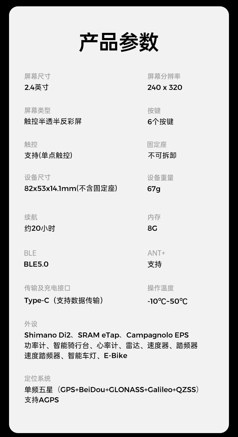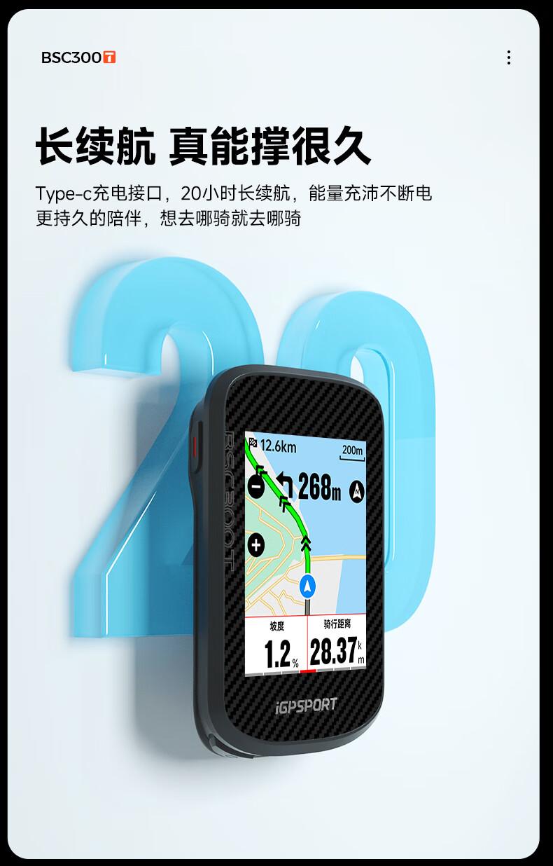 迹驰 BSC300T 码表采用 USB-C 充电接口 ,官方宣称续航约 20 小时,可拓展连接速度、心率、踏频、功率计、智能骑行台等设备查看数据。另外,码表还支持配对手机查看消息通知 。