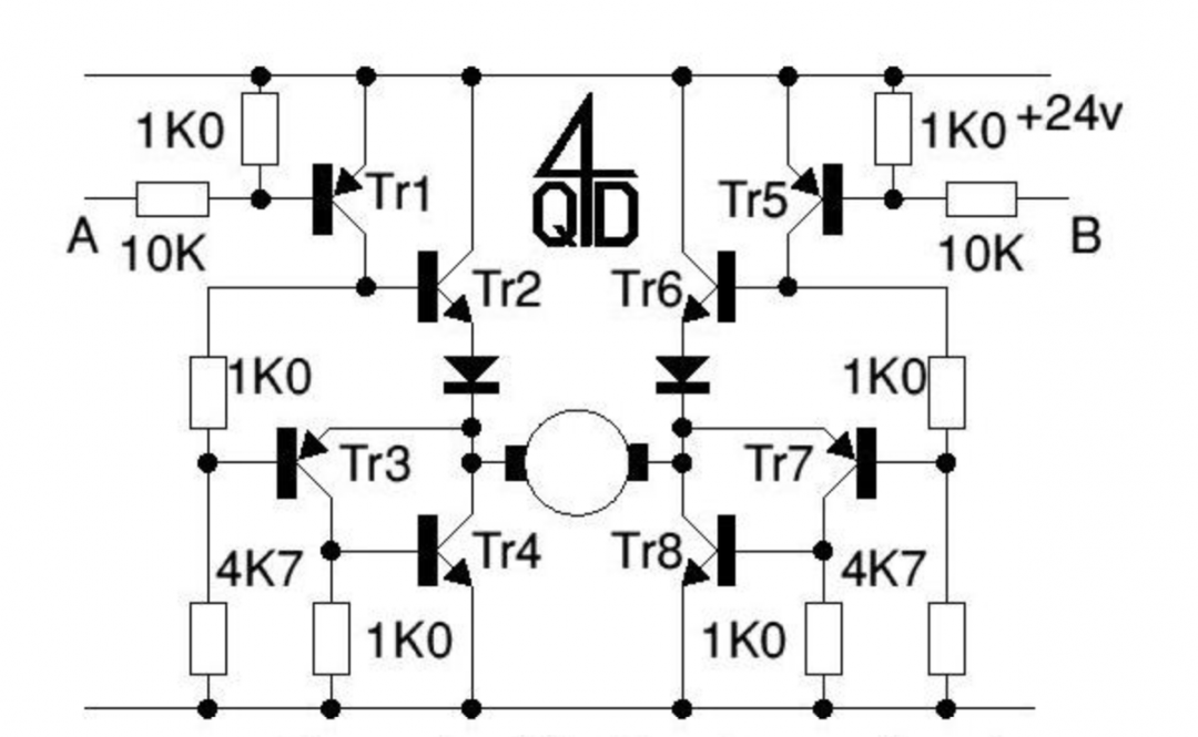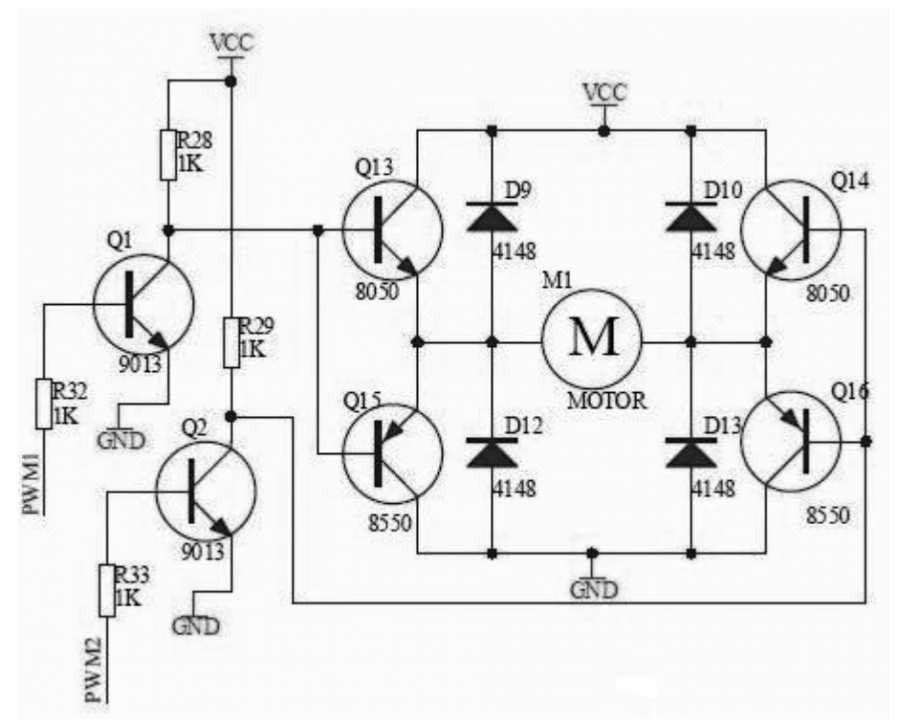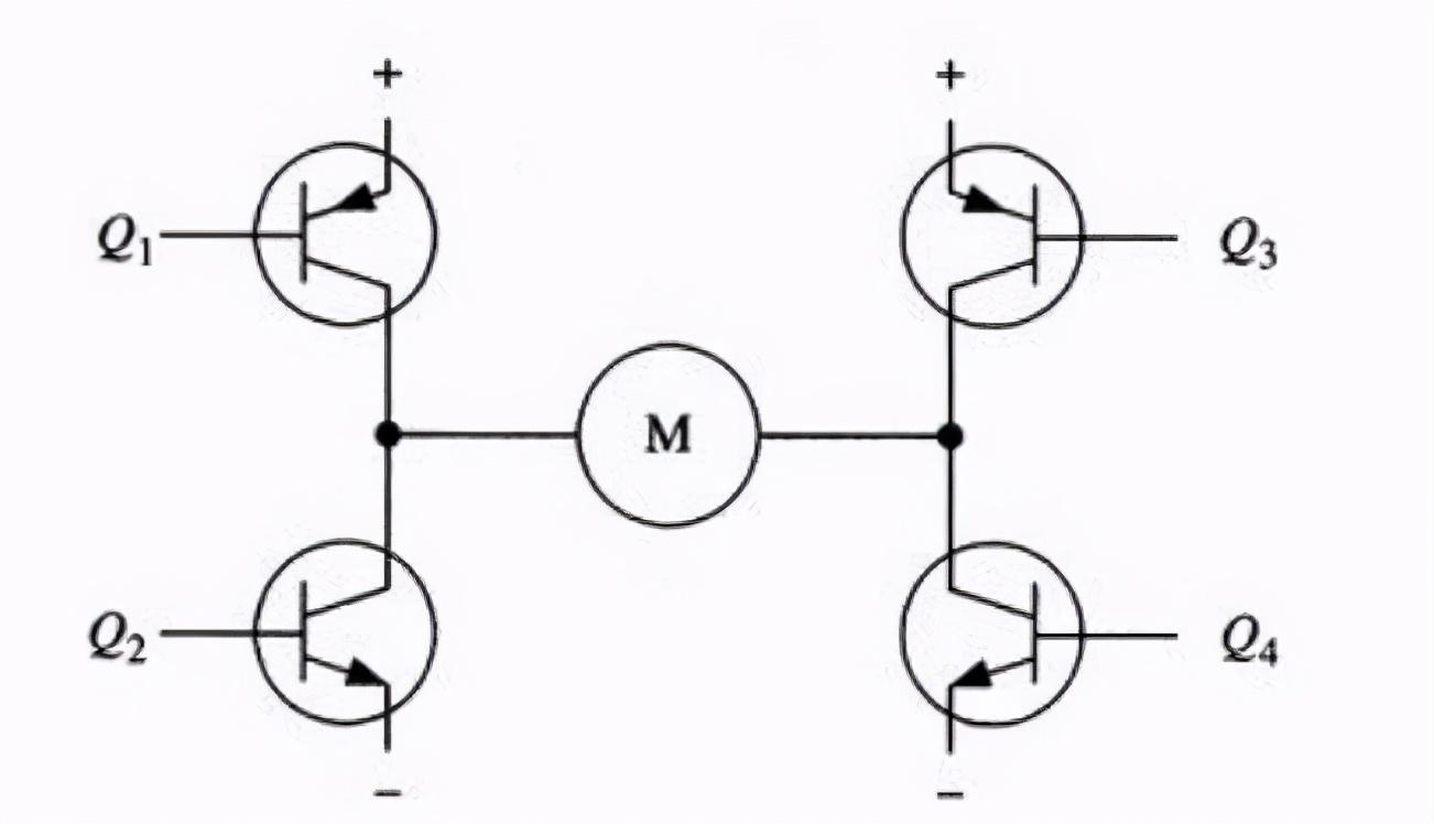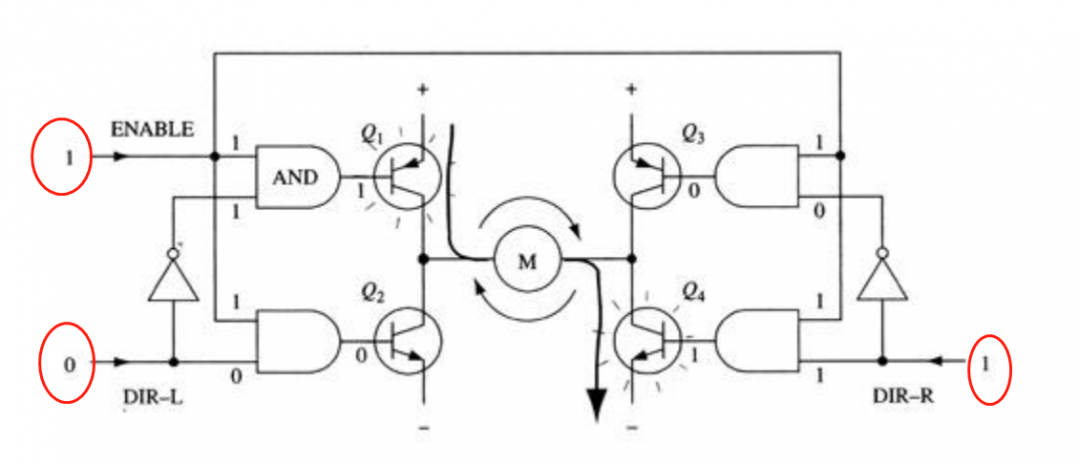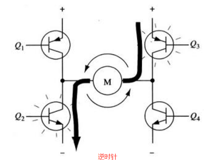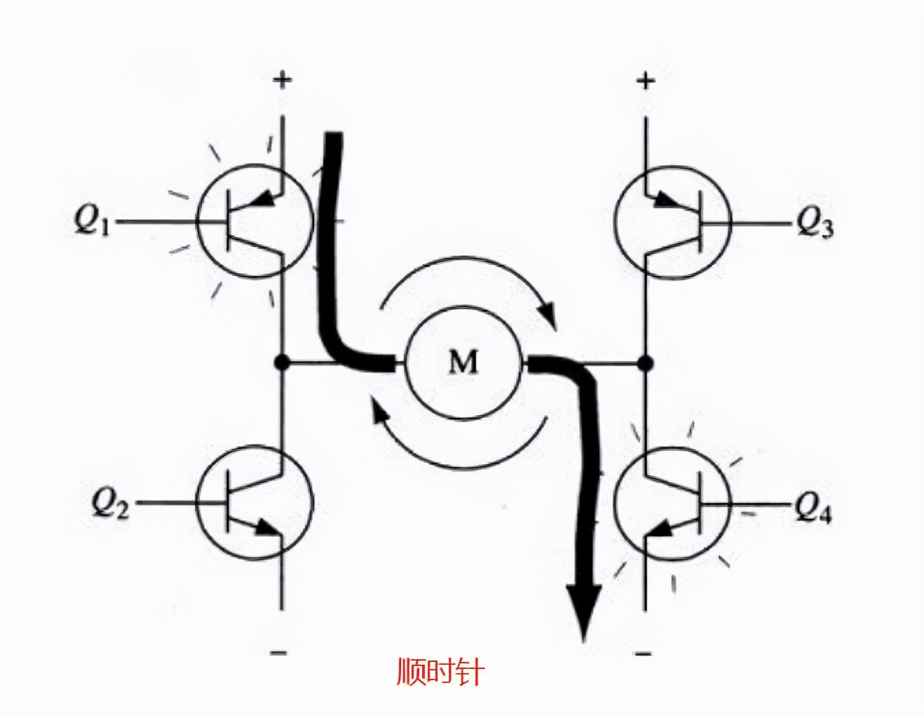 要使电机运转,必须使对角线上的一对三极管导通。例如,当 Q1管和 Q4 管导通时,电流就从电源正极经 Q1 从左至右穿过电机,然后再经 Q4 回到电源负极。按图中电流箭头所示,该流向的电流将驱动电机顺时针转动。当三极管 Q1 和 Q4 导通,电流将从左至右流过电机,从而驱动电机按特定方向转动(电机周围的箭头指示为顺时针方向)。同理Q2和Q3导通,则电机逆时针转动。(PS:同侧三极管不能同时打通,否则会造成短路,烧坏三极管。即Q1和Q2不能同时导通;Q3和Q4不能同时导通)
