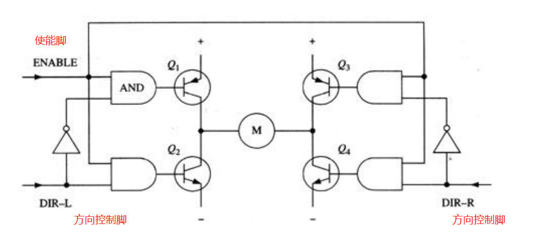 但是可能会有一些新手会不小心让同侧的三极管导通了,这样会让设计处于危险的状态,轻则元器件烧毁,重则起火造成财产生命损失。于是本着安全稳定的原则,在上述电路上做了一点改进。在基本 H 桥电路的基础上增加了4 个与门和 2 个非门。 4 个与门同一个“使能”导通信号相接,这样,用这一个信号就能控制整个电路的开关。而 2 个非门通过提供一种方向输人,可以保证任何时候在 H 桥的同侧腿上都只有一个三极管能导通。(与前面的示意图一样,下图所示也不是一个完整的电路图,特别是图中与门和三极管直接连接是不能正常工作的。)