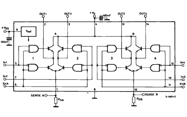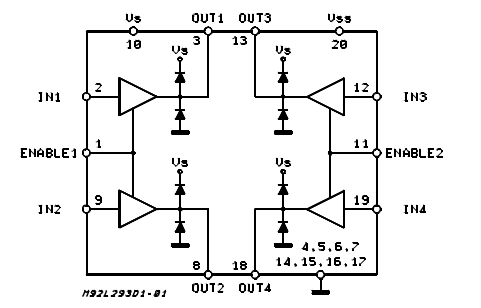 实际使用的时候,用分立元件制作 H 桥是很麻烦的,好在现在市面上有很多封装好的 H 桥集成电路,接上电源、电机和控制信号就可以使用了,在额定的电压和电流内使用非常方便可靠。比如常用的 L293D、 L298N等,下图为两个芯片的内部构造图。