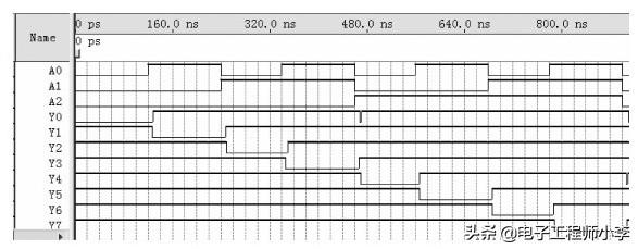 从图5-1仿真波形可以看到,8个输出信号按照A2、A1、A0组合的不同,分别产生低电平的有效信号。