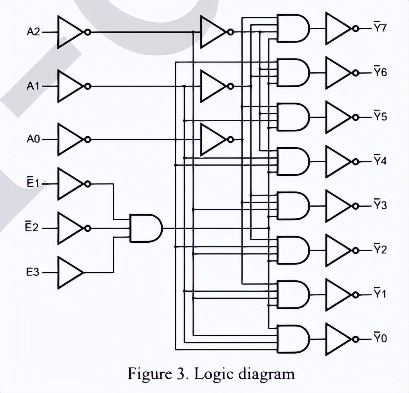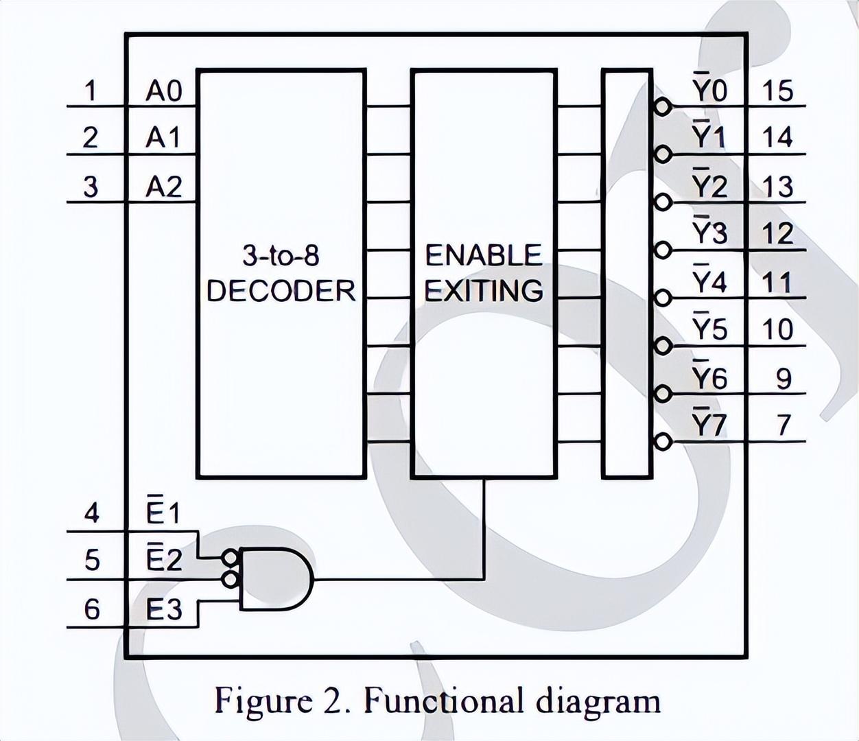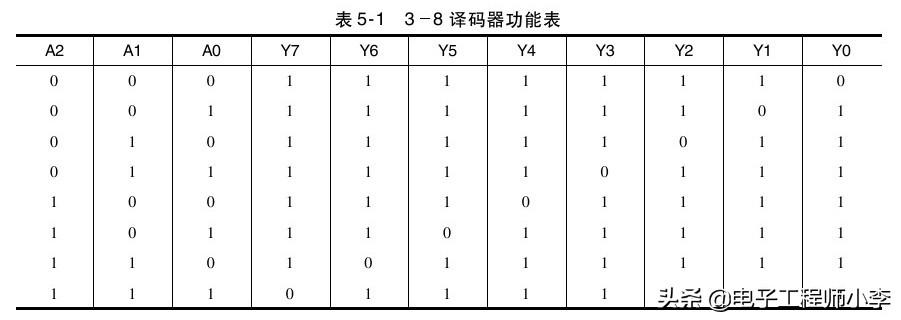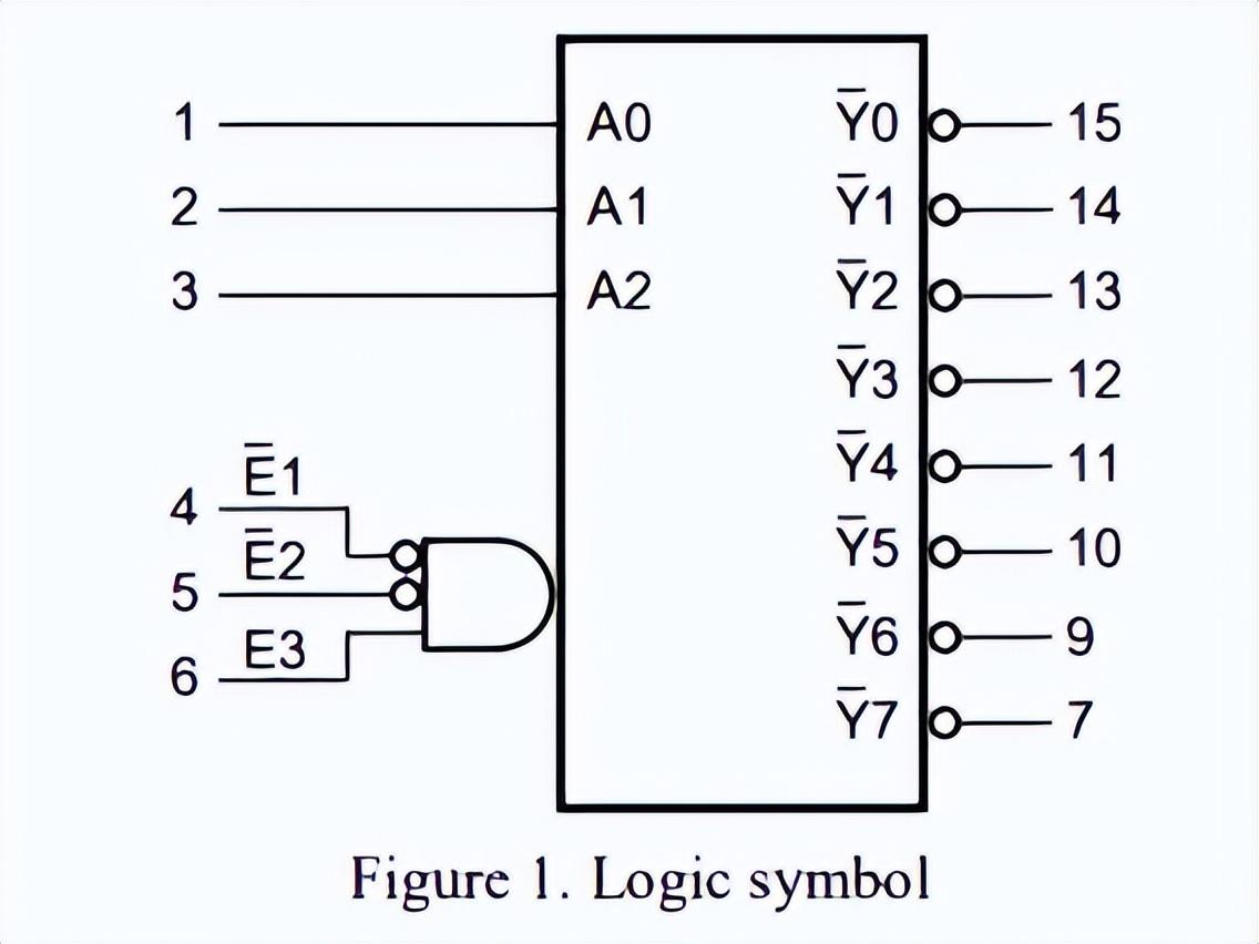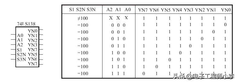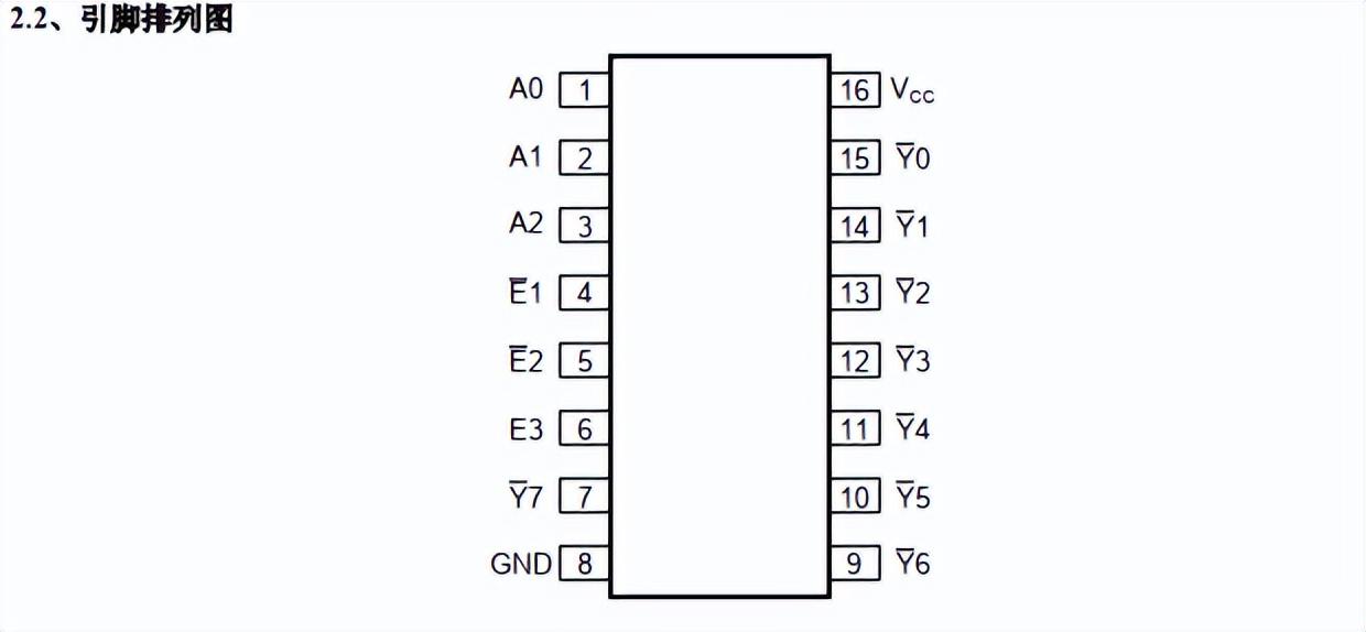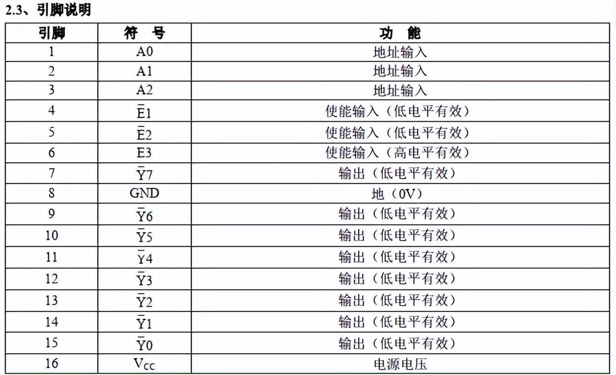 就是38译码器,是TTL系列的,也就是74系列,有三个输入端A0,A1,A2,其中A2是高位,输出是八个低电平输出Y0~Y7,工作电压一般的5V就可以了,举个例子,你A0,A1...就...