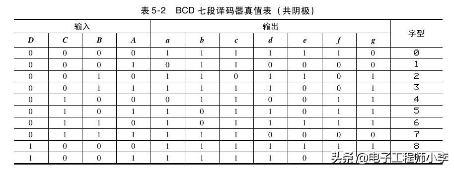 七段译码器是对4位二进制数进行译码,从而使七段数码管上显示相应十进制数的译码电路。数码管有共阴阳极之分,所以相应的译码电路也不同。图5-3为共阴极数码管的结构图及译码器与数码管的接线。表5-2列出了共阴极译码电路的真值表。