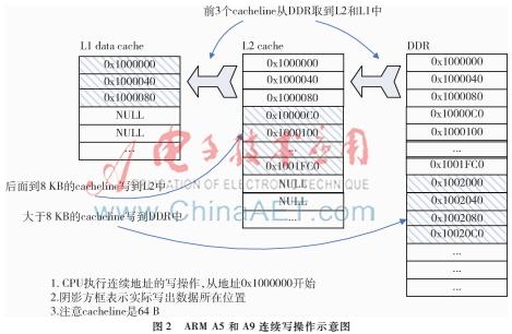 实际上由于Cache的存在,数值并不是直接写到DDR中。对于ARM cortexA5和cortexA9 CPU,这一过程如图1所示。