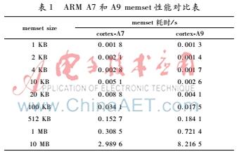 根据上面的分析,对于CPU向外写数据的操作,在小于一定大小的情况下,实际上并不会操作DDR,而是在操作L2 Cache。表1是两款手机CPU 同频下的memset性能对比,它们的CPU分别使用了ARM cortexA7和cortexA9。