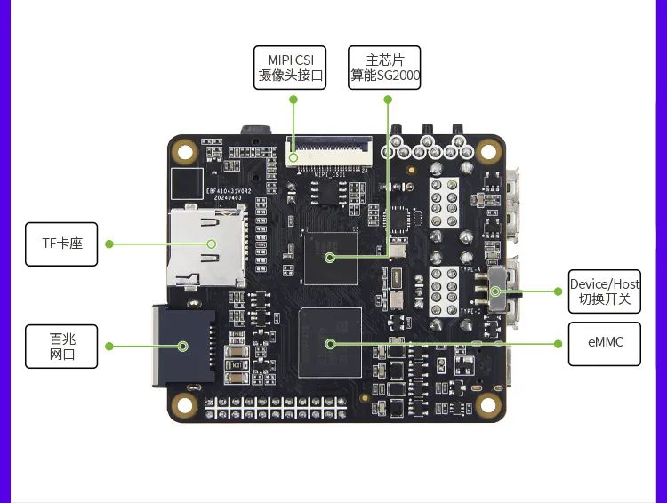 该板使用算能 SG2000 作为主芯片,搭配双频 Wi-Fi 5 + 蓝牙 4.2 、USB 2.0、双 MIPI CSI、MIPI DSI、以太网、TF 卡座等外设,引出 22Pin 未使用引脚,支持 GPIO、I2C、UART 等功能。