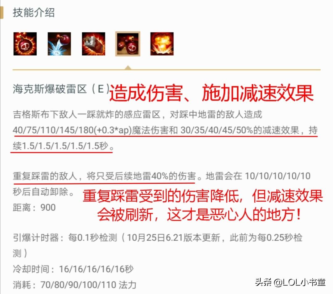 这个技能为什么恶心人?就是因为这个技能的每一颗独立地雷,都能够造成伤害,并给敌人施加减速效果。 重复踩雷受到的伤害会减少60%,但重复踩雷受到的减速效果将会刷新,每一个小地雷都会使敌人受到1.5秒的减速,这就是这个技能恶心人的地方。