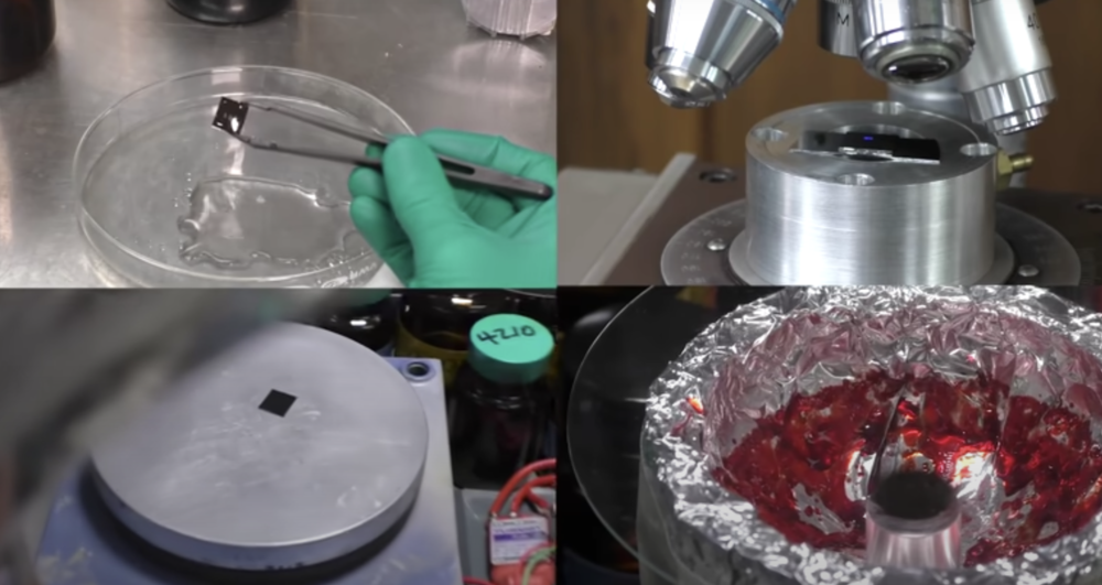 而“刻蚀”步骤,很像是一节大学里的化学实验课:用酸(各种溶剂)腐蚀每块芯片,再将它扔进在1000摄氏度左右的炉子里烘烤,以调整电导率,然后送入真空室做进一步处理。