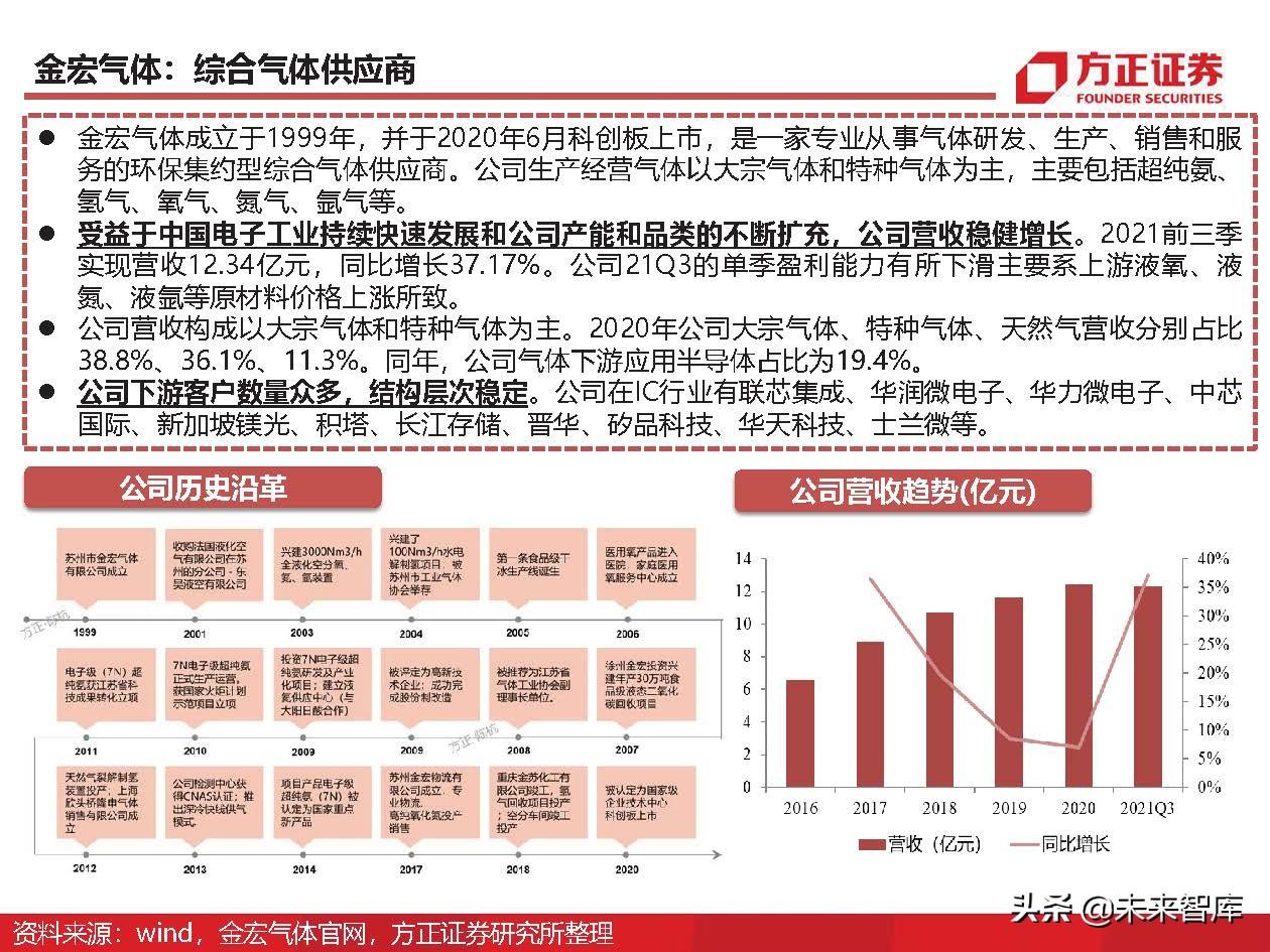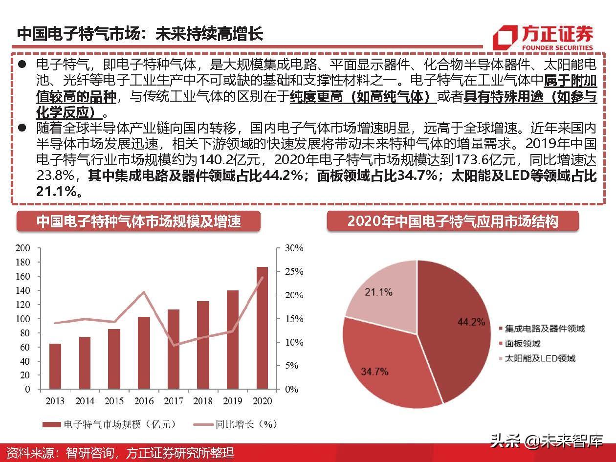 电子特气,即电子特种气体,是大规模集成电路、平面显示器件、化合物半导体器件、太阳能电 池、光纤等电子工业生产中不可或缺的基础和支撑性材料之一。电子特气在工业气体中属于附加 值较高的品种,与传统工业气体的区别在于纯度更高(如高纯气体)或者具有特殊用途(如参与 化学反应)。