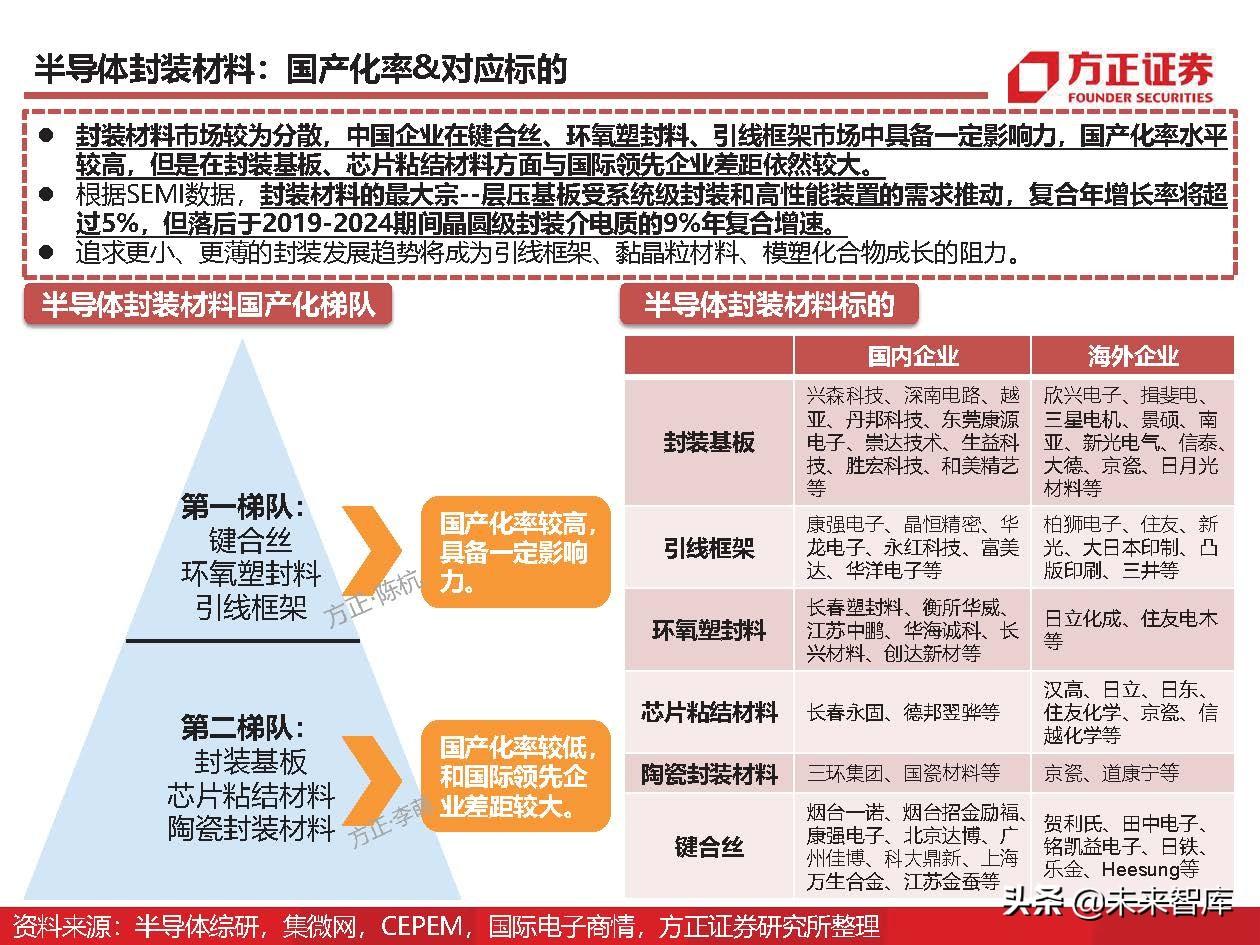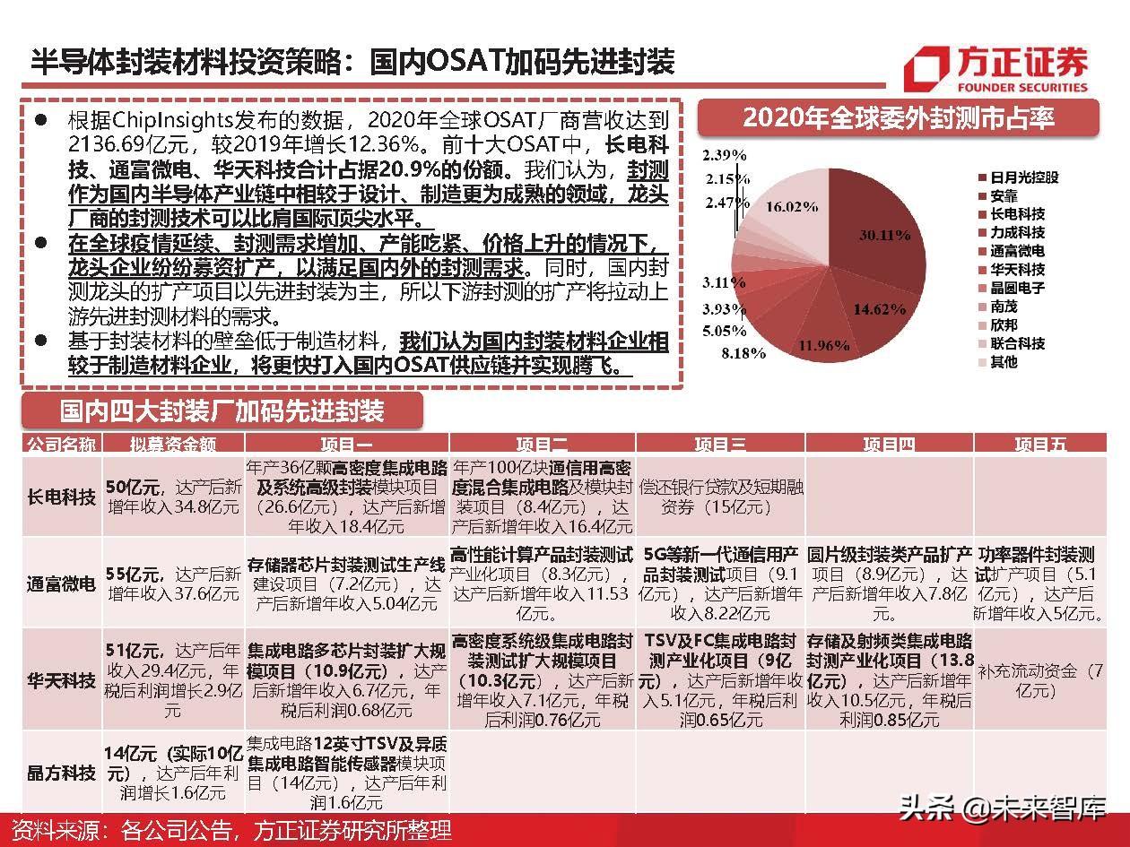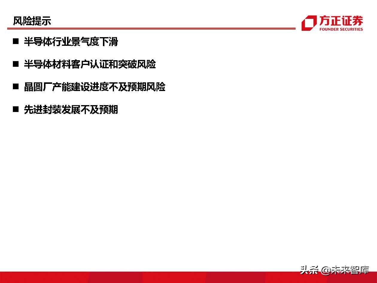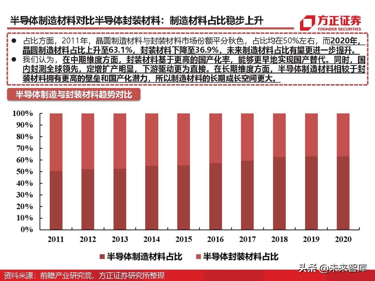 我们认为,在中期维度方面,封装材料基于更高的国产化率,能够更早地实现国产替代。同时,国 内封测全球领先,定增扩产明显,下游驱动更为直接。在长期维度方面,半导体制造材料相较于封 装材料拥有更高的壁垒和国产化潜力,所以制造材料的长期成长空间更大。