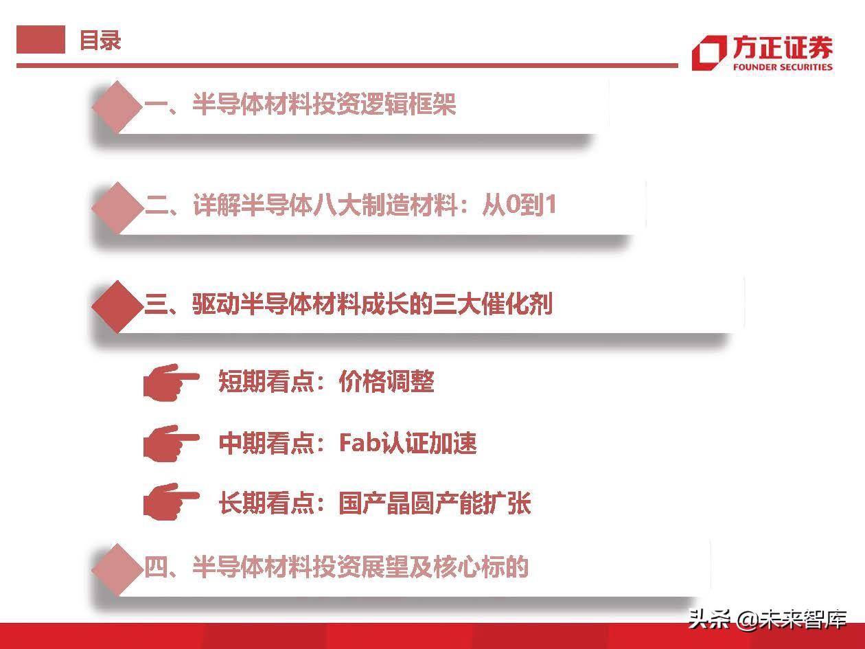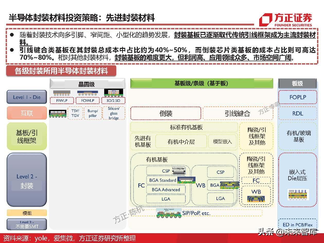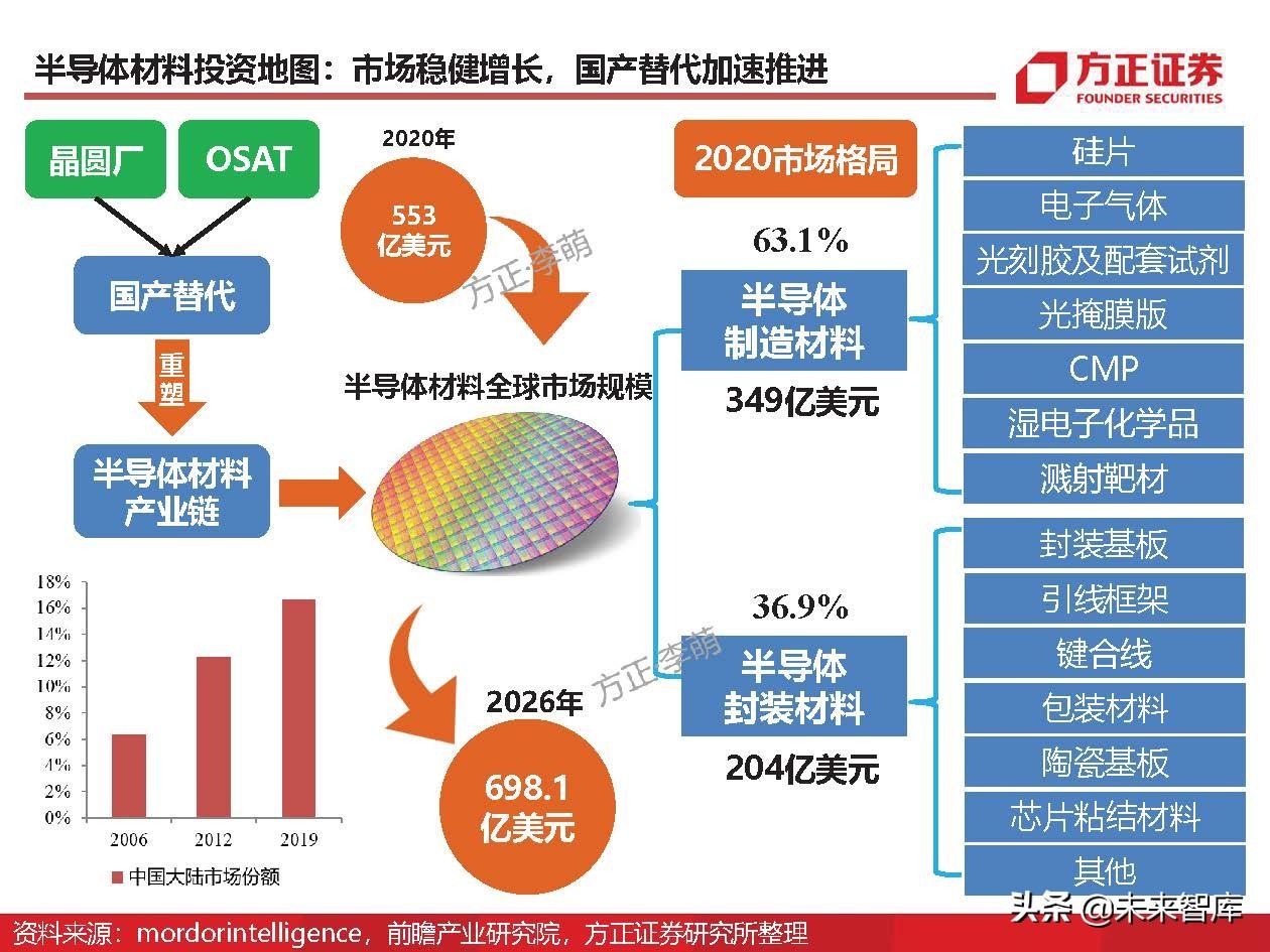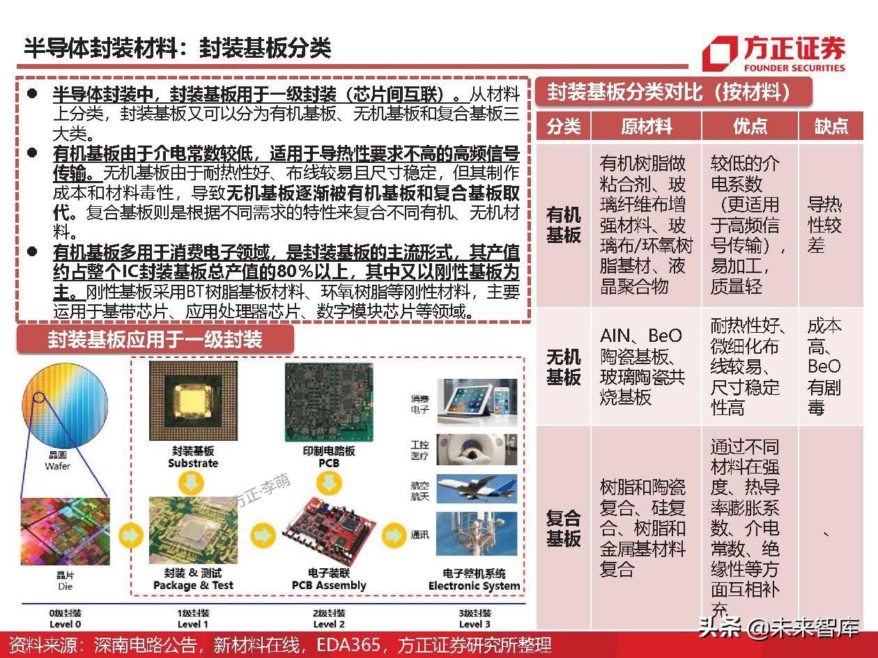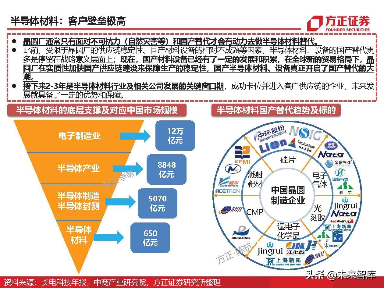 我们认为,在中期维度方面,封装材料基于更高的国产化率,能够更早地实现国产替代。同时,国 内封测全球领先,定增扩产明显,下游驱动更为直接。在长期维度方面,半导体制造材料相较于封 装材料拥有更高的壁垒和国产化潜力,所以制造材料的长期成长空间更大。