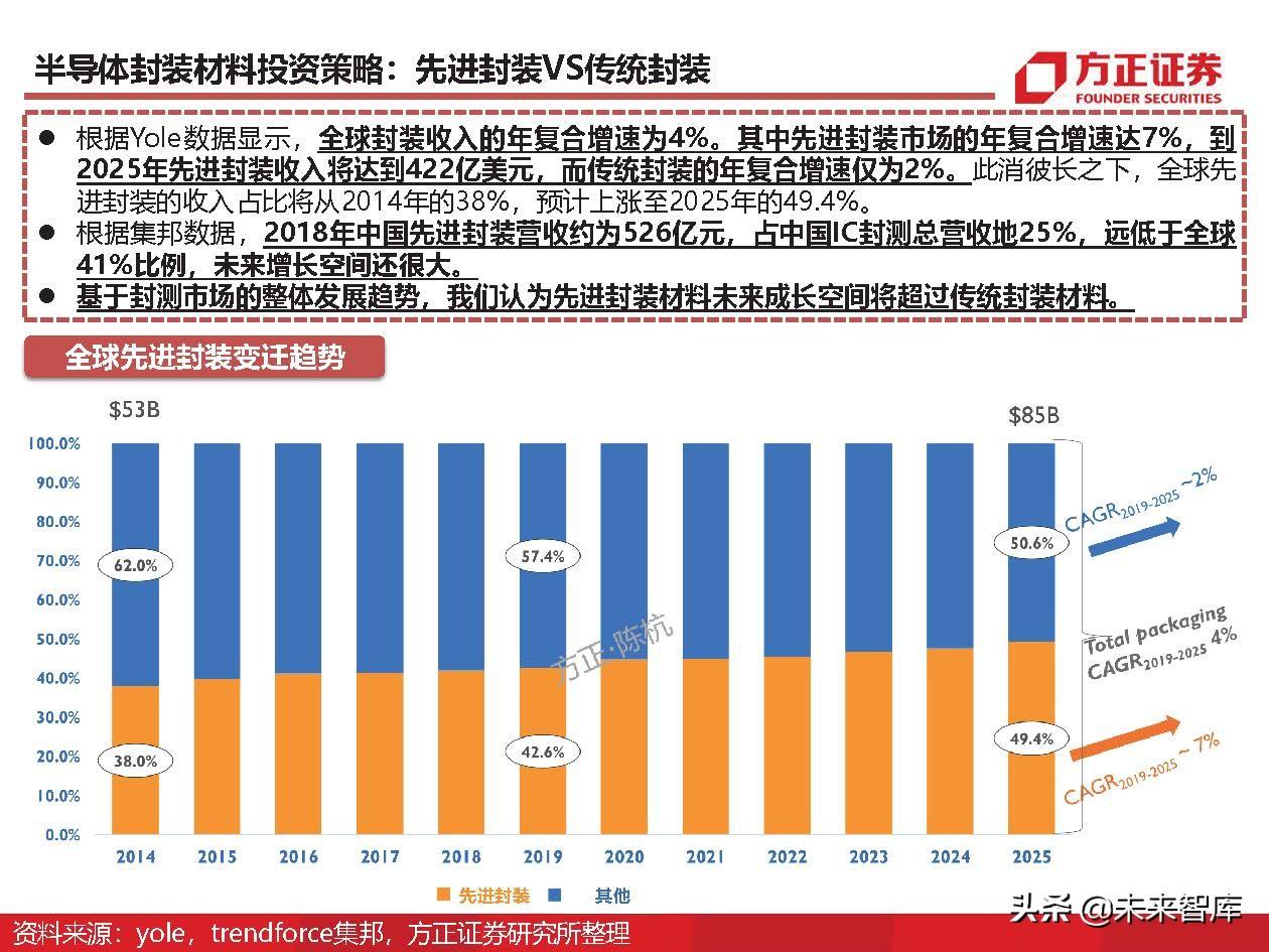 先进封装VS传统封装: 根据Yole数据显示,全球封装收入的年复合增速为4%。其中先进封装市场的年复合增速达7%,到 2025年先进封装收入将达到422亿美元,而传统封装的年复合增速仅为2%。此消彼长之下,全球先 进封装的收入占比将从2014年的38%,预计上涨至2025年的49.4%。