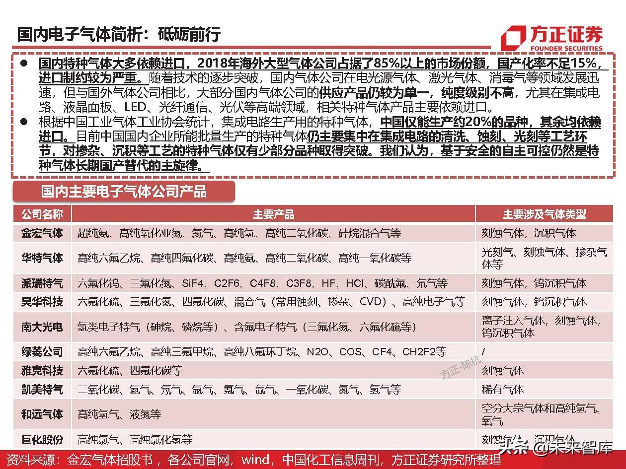 国内特种气体大多依赖进口,2018年海外大型气体公司占据了85%以上的市场份额,国产化率不足15%, 进口制约较为严重。随着技术的逐步突破,国内气体公司在电光源气体、激光气体、消毒气等领域发展迅 速,但与国外气体公司相比,大部分国内气体公司的供应产品仍较为单一,纯度级别不高,尤其在集成电 路、液晶面板、LED、光纤通信、光伏等高端领域,相关特种气体产品主要依赖进口。