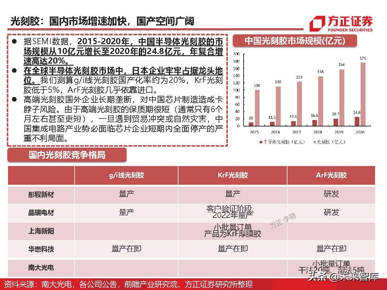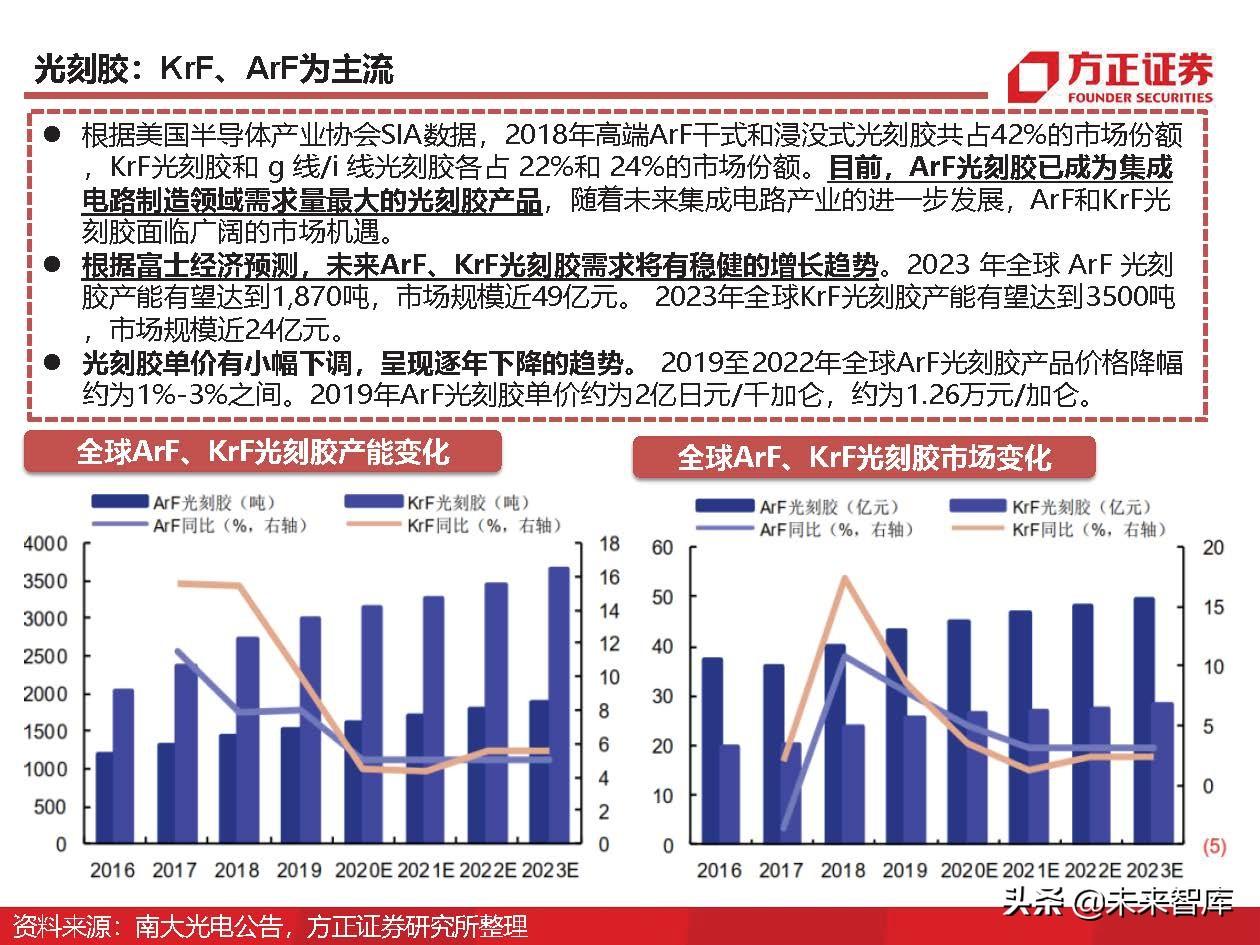 KrF、ArF为主流: 根据美国半导体产业协会SIA数据,2018年高端ArF干式和浸没式光刻胶共占42%的市场份额 ,KrF光刻胶和 g 线/i 线光刻胶各占 22%和 24%的市场份额。目前,ArF光刻胶已成为集成 电路制造领域需求量最大的光刻胶产品,随着未来集成电路产业的进一步发展,ArF和KrF光 刻胶面临广阔的市场机遇。