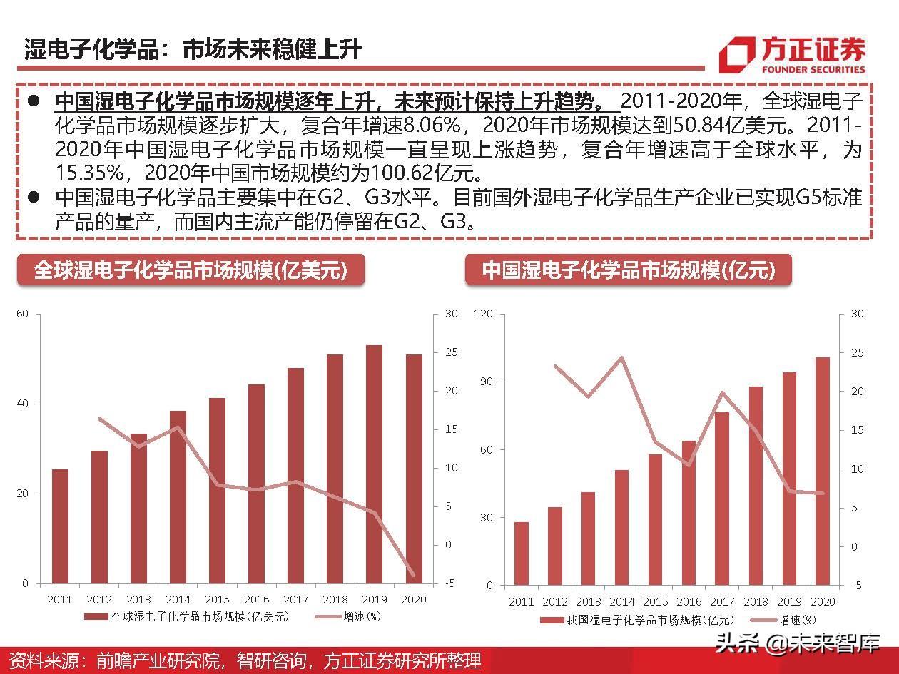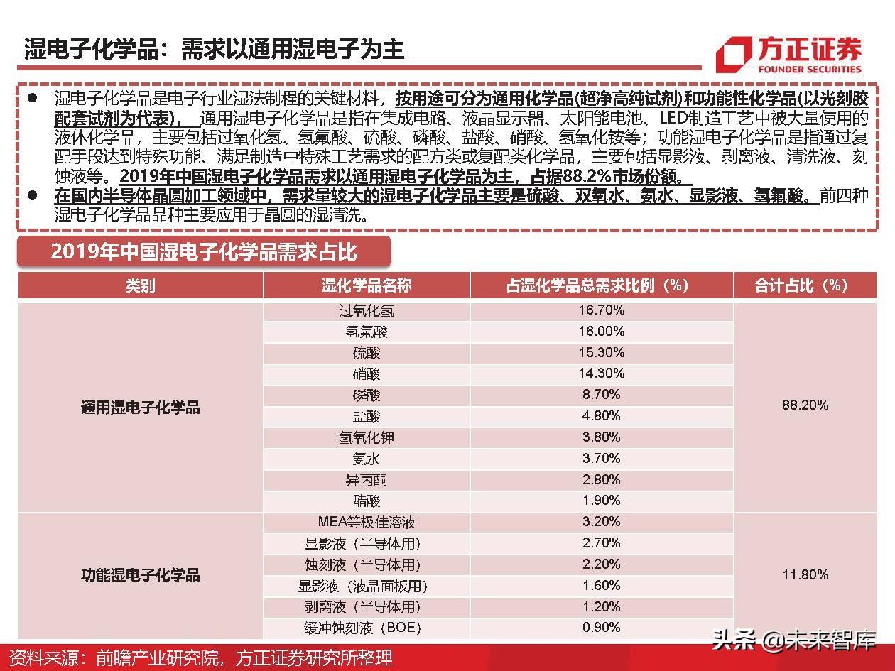 湿电子化学品是电子行业湿法制程的关键材料,按用途可分为通用化学品(超净高纯试剂)和功能性化学品(以光刻胶 配套试剂为代表), 通用湿电子化学品是指在集成电路、液晶显示器、太阳能电池、LED制造工艺中被大量使用的 液体化学品,主要包括过氧化氢、氢氟酸、硫酸、磷酸、盐酸、硝酸、氢氧化铵等;功能湿电子化学品是指通过复 配手段达到特殊功能、满足制造中特殊工艺需求的配方类或复配类化学品,主要包括显影液、剥离液、清洗液、刻 蚀液等。2019年中国湿电子化学品需求以通用湿电子化学品为主,占据88.2%市场份额。