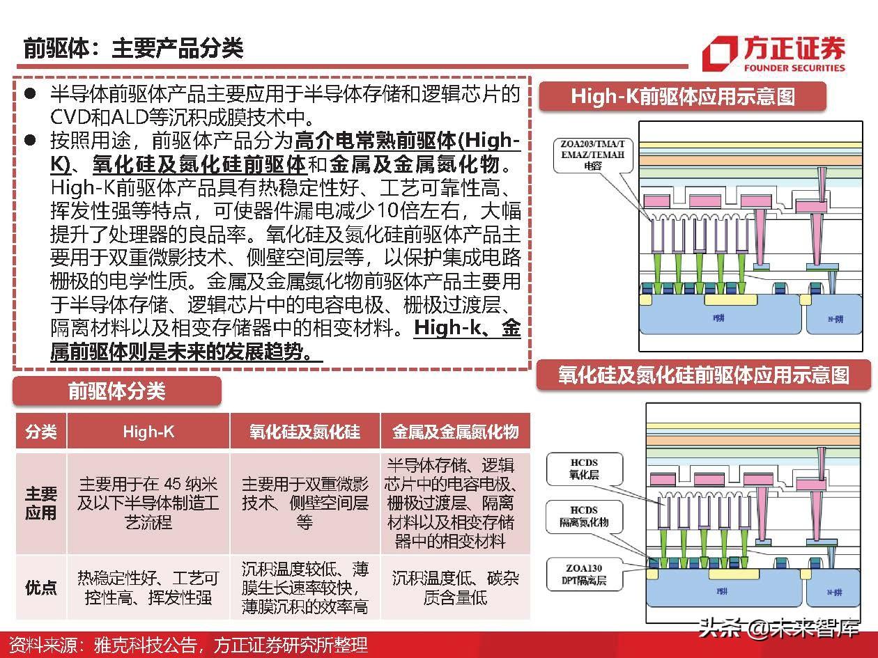 前驱体是半导体薄膜沉积工艺的主要原材料,化学性质上半导体前驱体为携有目标元素,呈 气态或易挥发液态,具备化学热稳定性,同时具备相应的反应活性或物理性能的一类物质。