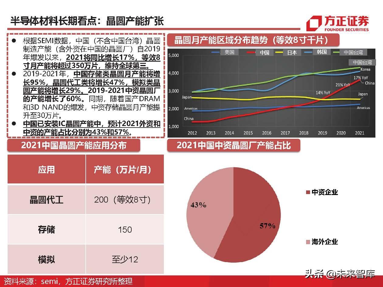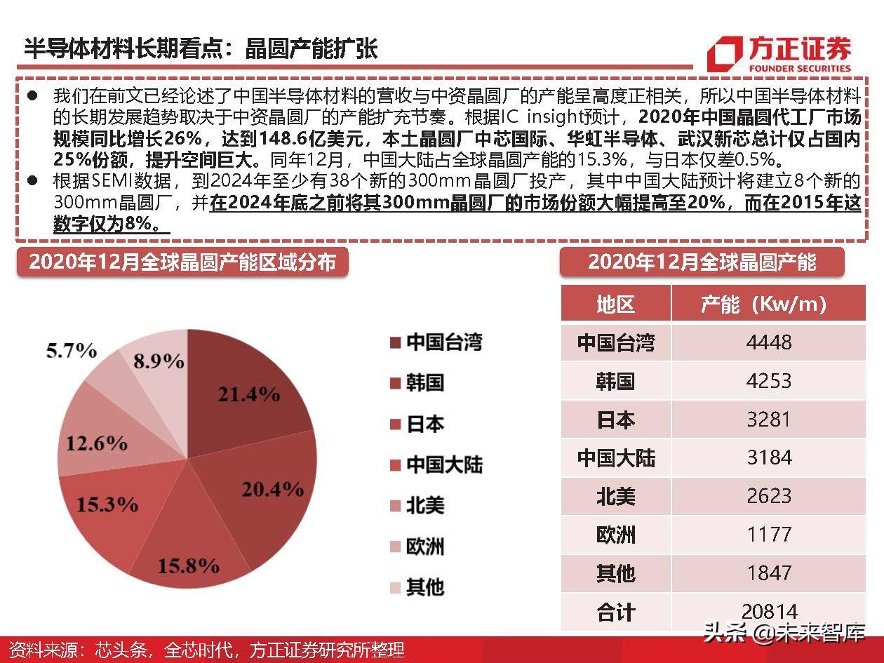 我们在前文已经论述了中国半导体材料的营收与中资晶圆厂的产能呈高度正相关,所以中国半导体材料 的长期发展趋势取决于中资晶圆厂的产能扩充节奏。根据IC insight预计,2020年中国晶圆代工厂市场 规模同比增长26%,达到148.6亿美元,本土晶圆厂中芯国际、华虹半导体、武汉新芯总计仅占国内 25%份额,提升空间巨大。同年12月,中国大陆占全球晶圆产能的15.3%,与日本仅差0.5%。