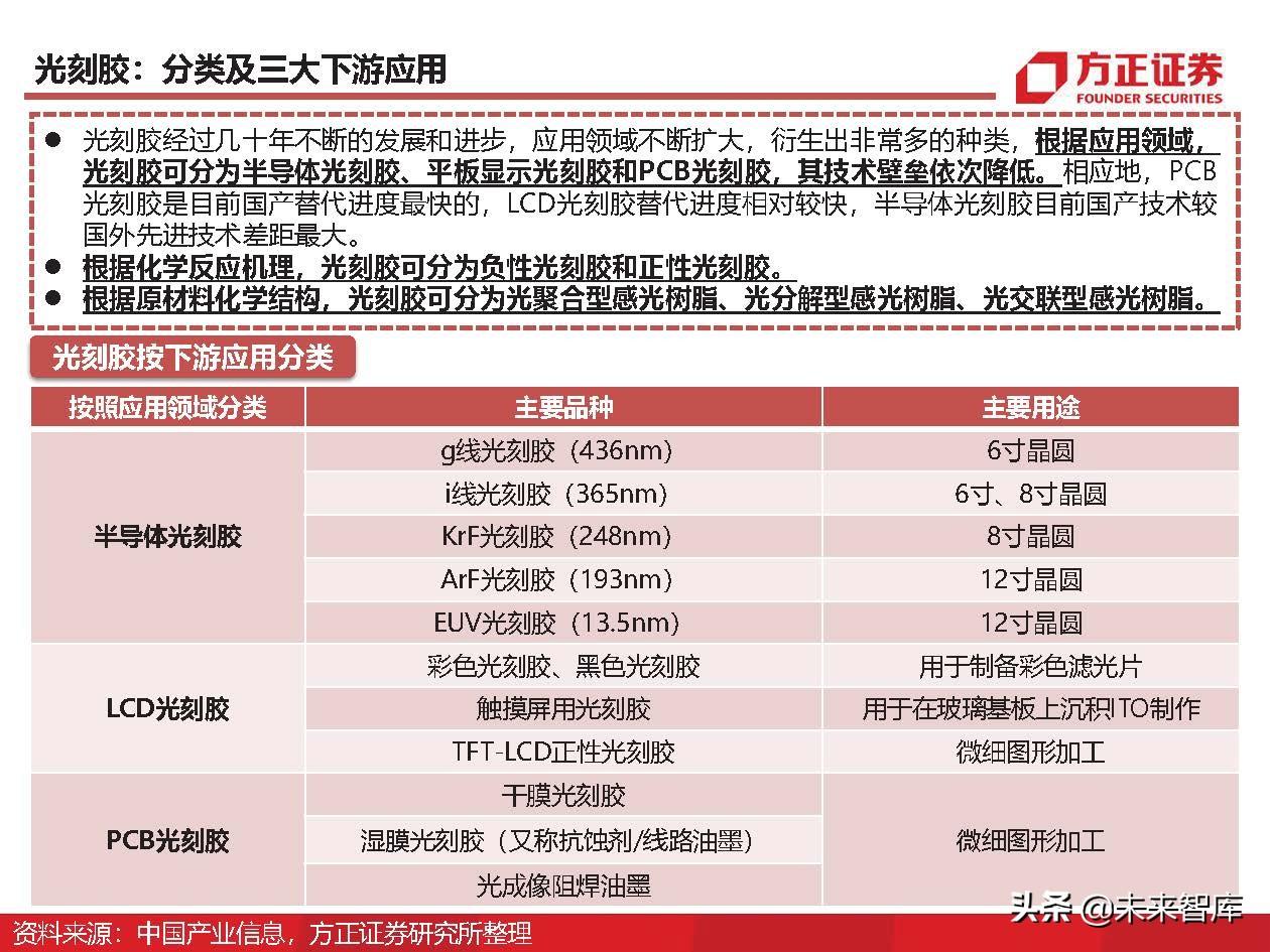 分类及三大下游应用: 光刻胶经过几十年不断的发展和进步,应用领域不断扩大,衍生出非常多的种类,根据应用领域, 光刻胶可分为半导体光刻胶、平板显示光刻胶和PCB光刻胶,其技术壁垒依次降低。相应地,PCB 光刻胶是目前国产替代进度最快的,LCD光刻胶替代进度相对较快,半导体光刻胶目前国产技术较 国外先进技术差距最大。