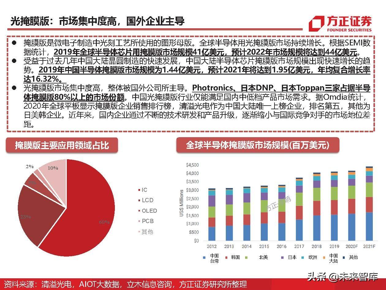 掩膜版是微电子制造中光刻工艺所使用的图形母版。全球半导体用光掩膜版市场持续增长。根据SEMI数 据统计,2019年全球半导体芯片用掩膜版市场规模41亿美元,预计2022年市场规模将达到44亿美元。