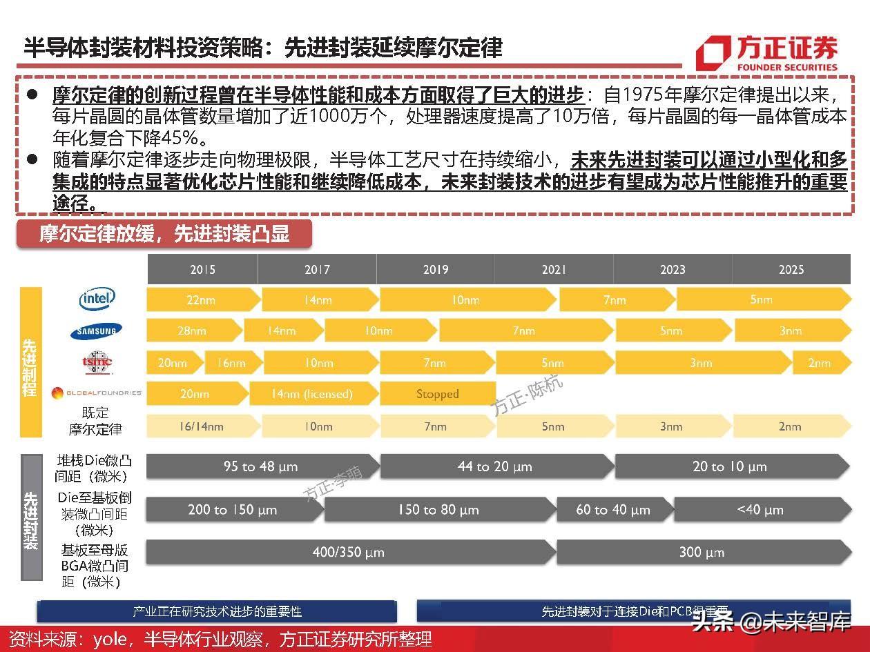 先进封装延续摩尔定律: 摩尔定律的创新过程曾在半导体性能和成本方面取得了巨大的进步:自1975年摩尔定律提出以来, 每片晶圆的晶体管数量增加了近1000万个,处理器速度提高了10万倍,每片晶圆的每一晶体管成本 年化复合下降45%。