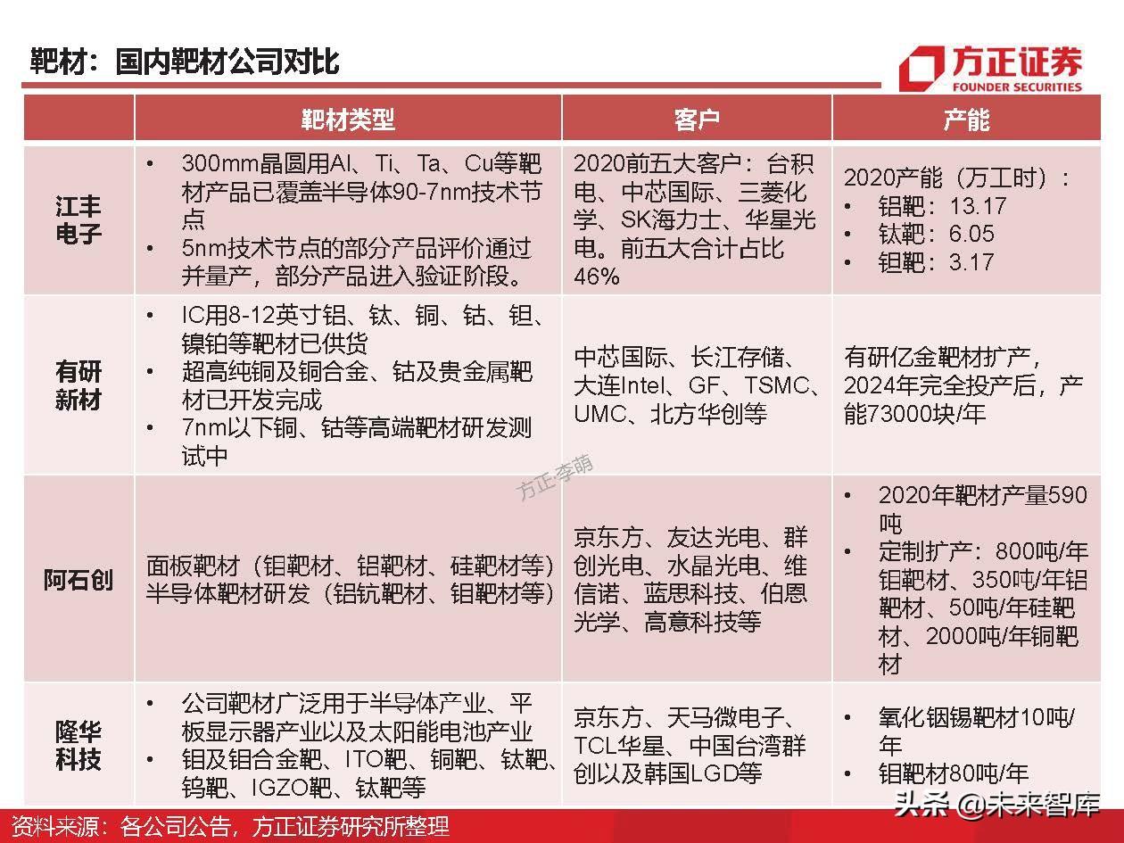 依据2020年全球半导体制造材料349亿美元规模和靶材3%左右占比计算,2020年全球靶材市 场规模10.5亿美元左右。根据techcet数据,2020-2024年全球靶材市场年复合增速5%,预 计2024年全球溅射靶材市场12.8亿美元左右。