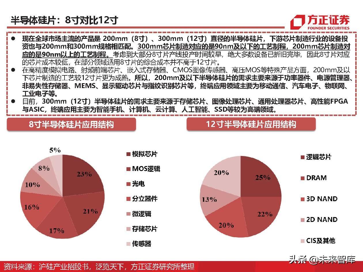 8寸对比12寸: 现在全球市场主流的产品是 200mm(8寸)、300mm(12寸)直径的半导体硅片,下游芯片制造行业的设备投 资也与200mm和300mm规格相匹配。300mm芯片制造对应的是90nm及以下的工艺制程,200mm芯片制造对 应的是90nm以上的工艺制程。考虑到大部分8寸片产线投产时间较早,绝大多数设备已折旧完毕,因此8寸片对应 的芯片成本较低,在部分领域适用8寸片的综合成本并不高于12寸片。