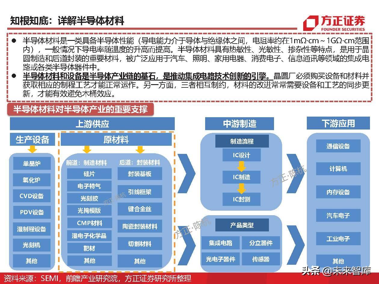 半导体材料是一类具备半导体性能(导电能力介于导体与绝缘体之间,电阻率约在1mΩ·cm~1GΩ·cm范围 内),一般情况下导电率随温度的升高而提高。半导体材料具有热敏性、光敏性、掺杂性等特点,是用于晶 圆制造和后道封装的重要材料,被广泛应用于汽车、照明、家用电器、消费电子、信息通讯等领域的集成电 路或各类半导体器件中。