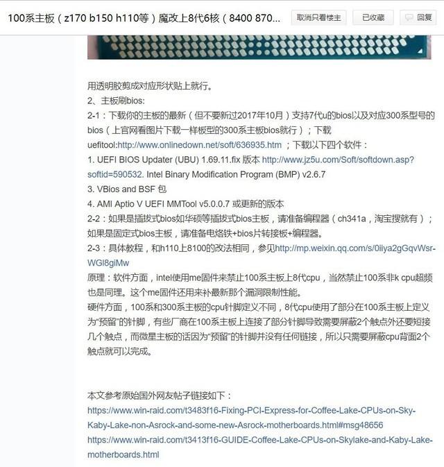 据百度贴吧的网友总结,六核心八代酷睿的破解要比四核心的i3要麻烦一些,需要屏蔽处理器的触点,并且进行UEFI BIOS 和ME 引擎微码的处理工作。某些品牌的主板可以用编程器添加,有些还需要动用烙铁。总的来说,这次的破解和之前相比,主要添加了硬件屏蔽无意义触点的过程,有些主板是两个,有些可能更多,更加考验动手能力。Z170/270主板和Z370之间的差价还是比较大,8代酷睿系列的价格也已经降到了很实惠的水平,如果想要超频,并且不在乎某些主板的PCI-E通道损失(个别主板会丢失第一条PCI-E 插槽功能),破解后的Z170、Z270主板还是很有性价比的,比还未上市的B360等更具价值。