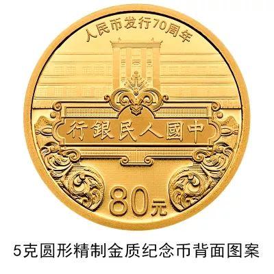 5克圆形金质纪念币背面图案为中国人民银行石家庄旧址建筑、董必武手书“中国人民银行”行名及人民币装饰图案组合设计,并刊“人民币发行70周年”中文字样及面额。