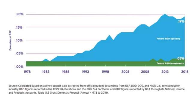 而从1980年代到千禧年,美国政府开始不断压缩军费、减少开支,经济结构也开始调整军事经济在国民经济中所占的比重,半导体领域的投资也逐步开始转移。到上世纪90年代中期,科技投资的份额已经减到了30%。