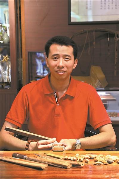 曾宪鹏介绍,要学习榄雕,有个说法是“三年满师”,榄雕工具种类繁多,每个榄雕手艺者至少拥有60把不同的榄雕刀具,只有跟着师傅学了3年之后,才有资格拿起刀具,真正地开始动手雕刻。虽然有一位醉心于榄雕技艺的父亲,但曾宪鹏一开始并没有打算从事榄雕工艺。他告诉记者,自己从小看着父亲制作榄雕,耳濡目染,对榄雕很感兴趣,但直到中学时学到《核舟记》这篇文章,曾宪鹏才眼前一亮:“这不正是父亲几十年如一日从事的手艺吗?原来我父亲这么了不起。”也正是从那时候起,曾宪鹏真正爱上了榄雕。