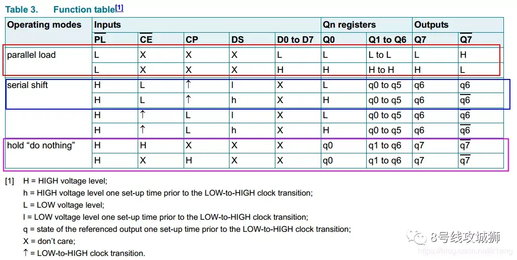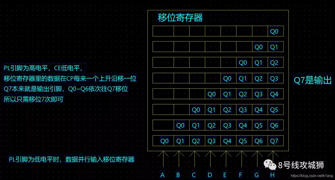 第二个蓝色框是串行移位,此时要求PL为高电平,CE为低电平,Q0~Q6在CP每来一个上升沿时依次往Q7移位;