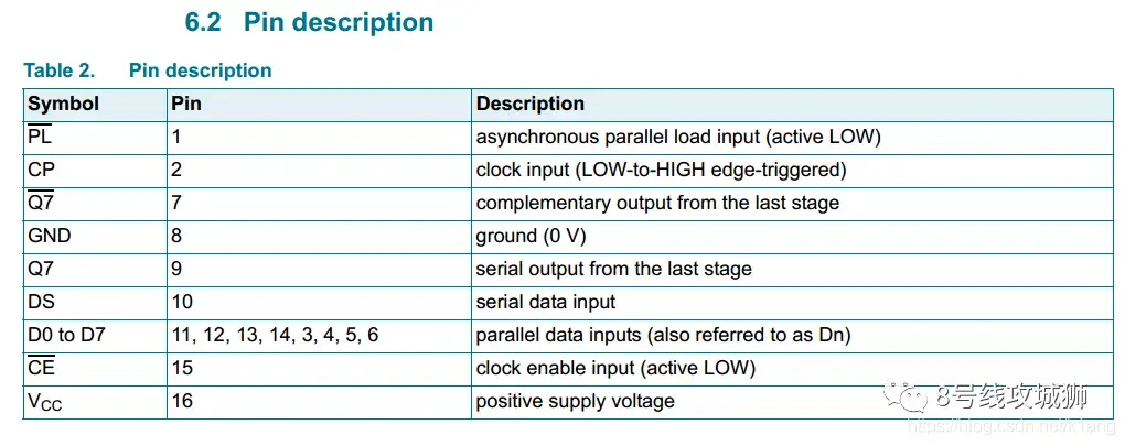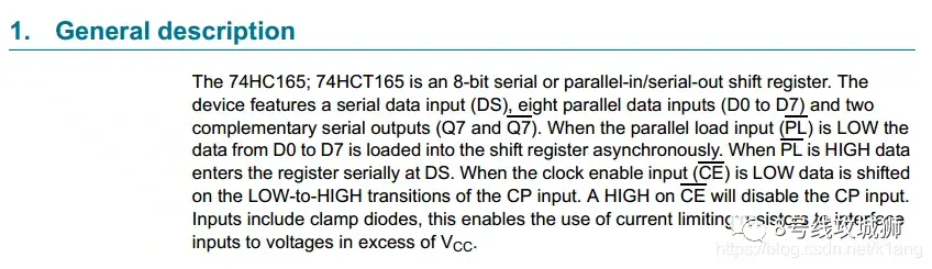 74HC165是个并行输入串行输出的逻辑芯片,了解一款芯片都是从它的datasheet开始,下面以NXP公司74HC165为例进行介绍。