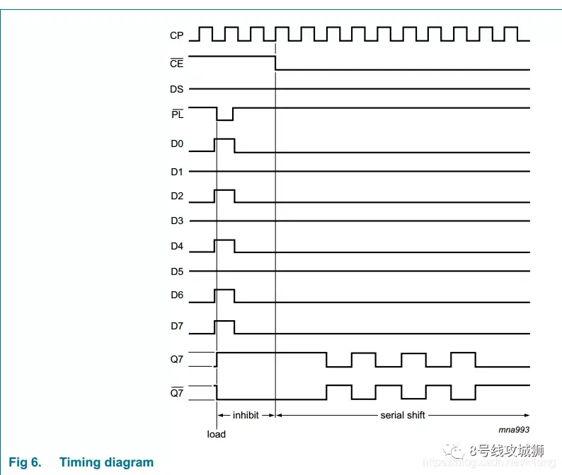 从上图可以看出,PL引脚控制并行数据的获取,低电平有效,数据进入8位移位寄存器,再由CP和CE两个引脚配合控制移位寄存器里的数据从Q7引脚串行输出。